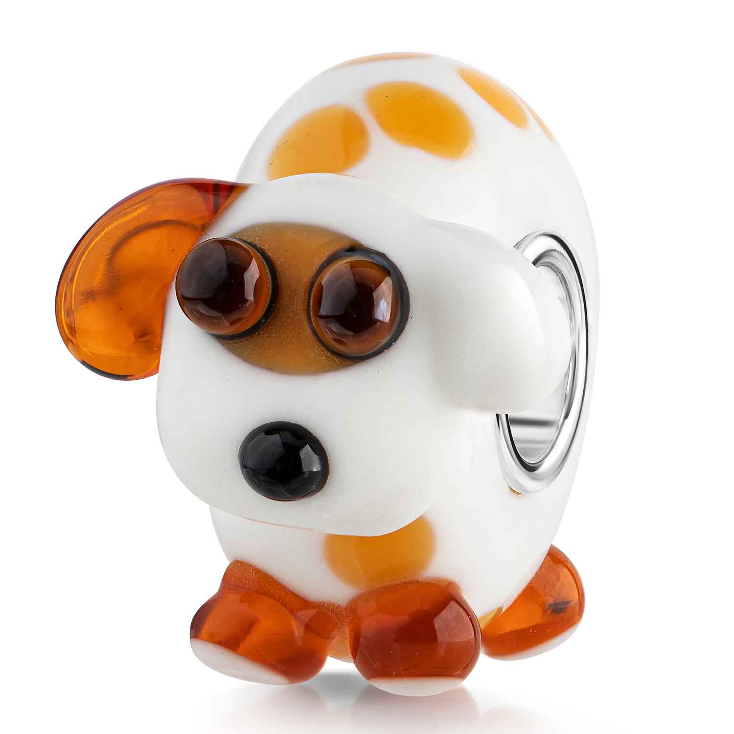 3D Bead in Form eines Hundes in weiß und braun, ausgestattet mit 925 Silber Hülse. Der Bead ist besonders für Kinder geeignet und passt auf Armbänder & Ketten bis 4,4mm Stärke.