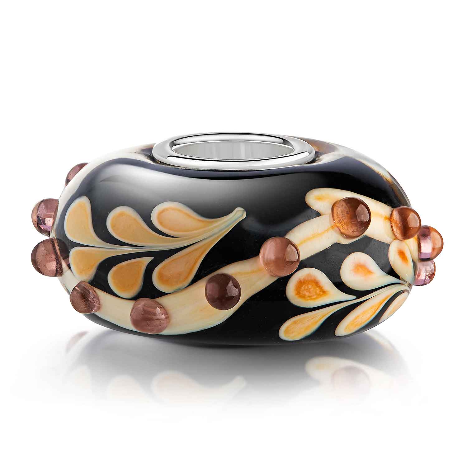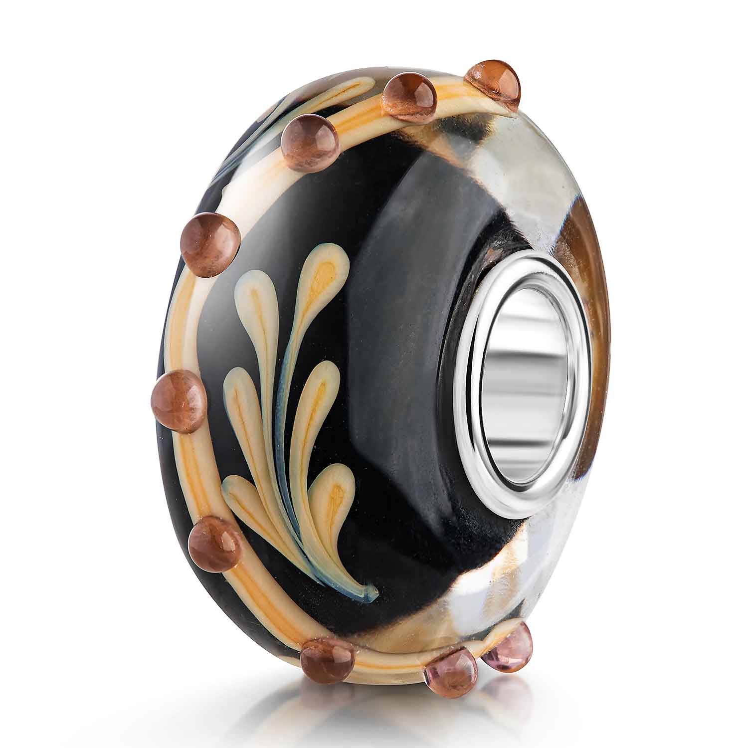 Schwarzer Glas Bead mit beigen Blätter Ornamenten und braunen 3D Punkten. Dieses Bead Element ist kompatibel zu allen Beads Armbändern & Ketten mit einer max. Stärke von 4,4mm.