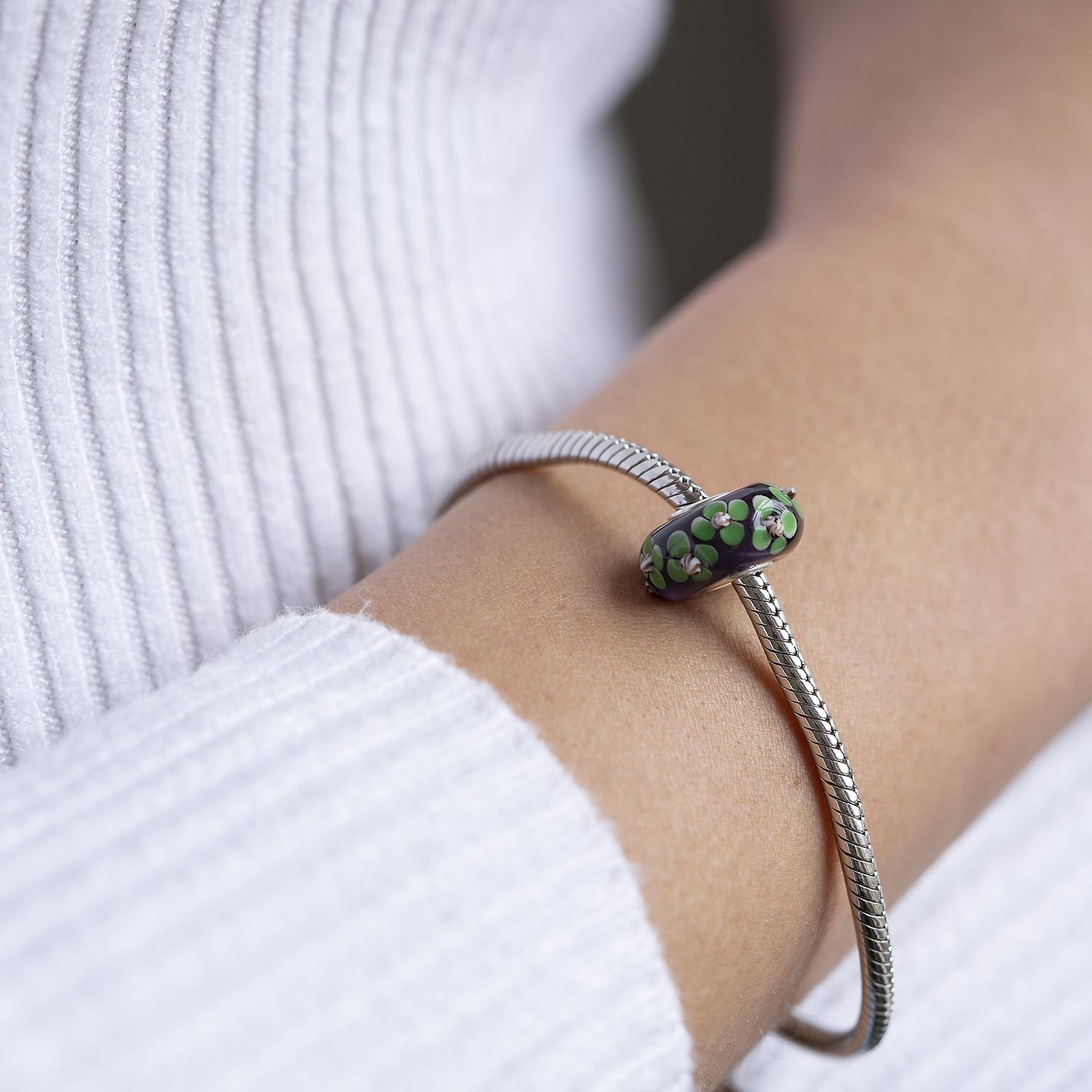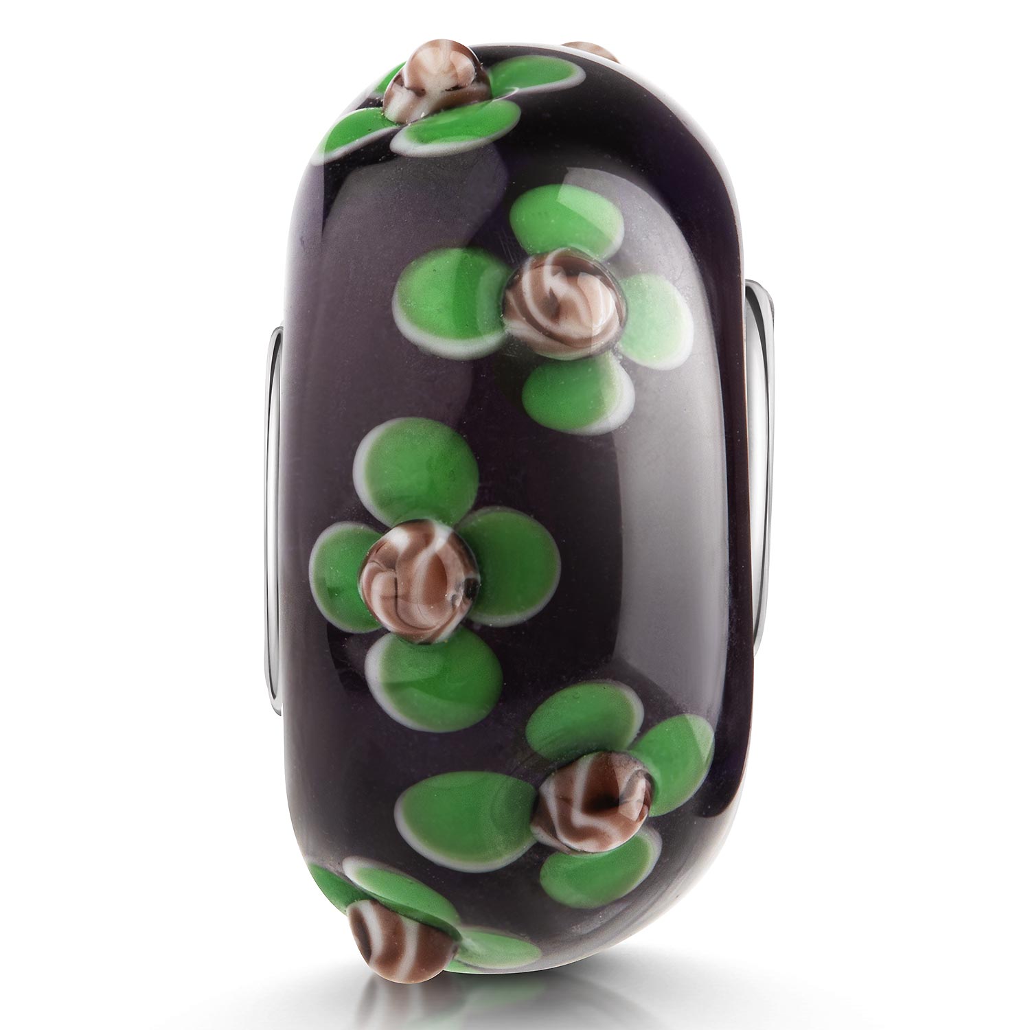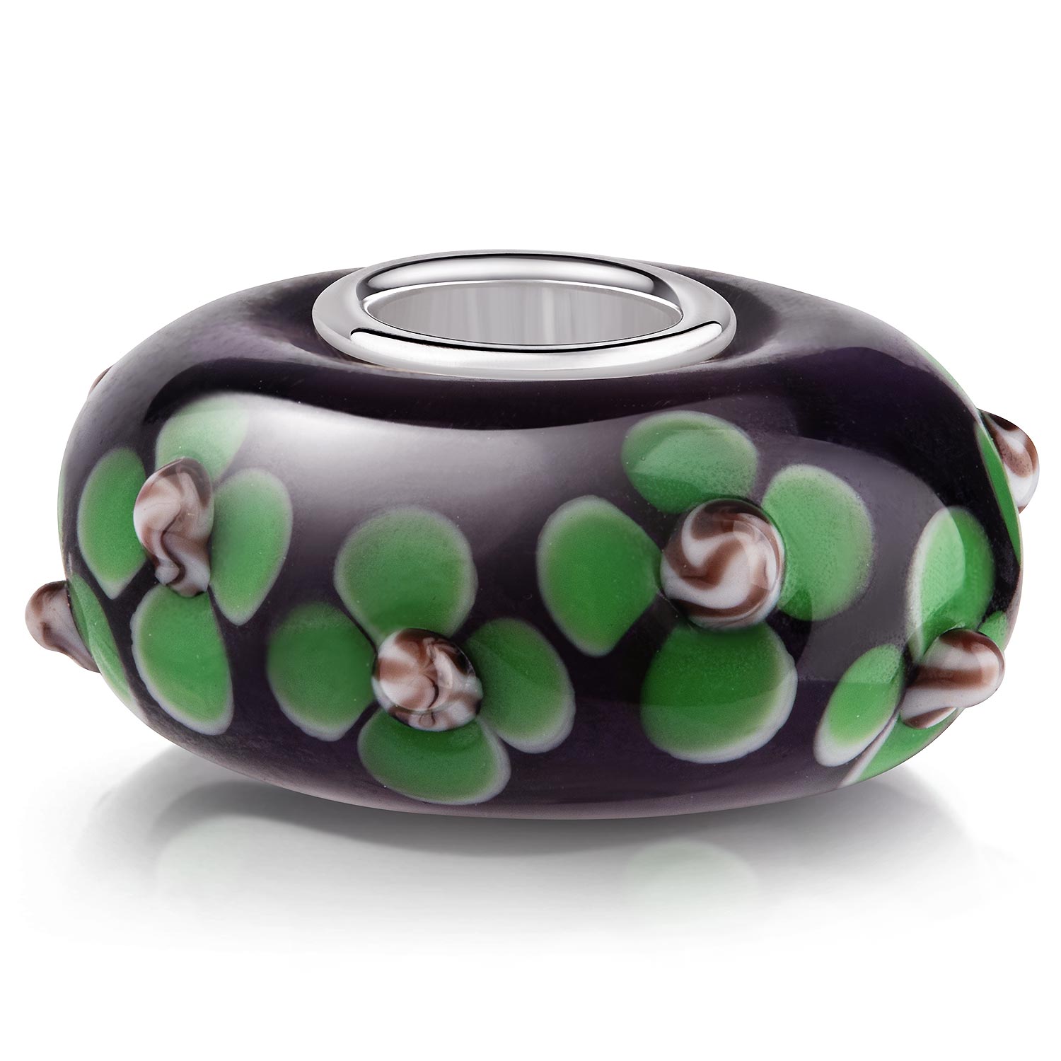 Schwarzer Glas Bead mit grünen Blumen Motiven im 3D-Design. Er ist zusätzlich mit einer Hülse aus massivem 925 Sterling Silber ausgestattet. Dieser Bead ist passend zu allen gängigen Beads Armbändern und Ketten bis max. 4,4mm Breite/ Durchmesser und ist daher auch besonders für alle gängigen großen Beads Marken geeignet.