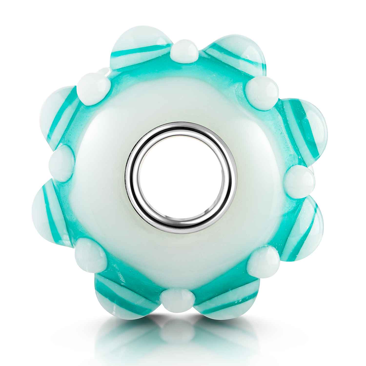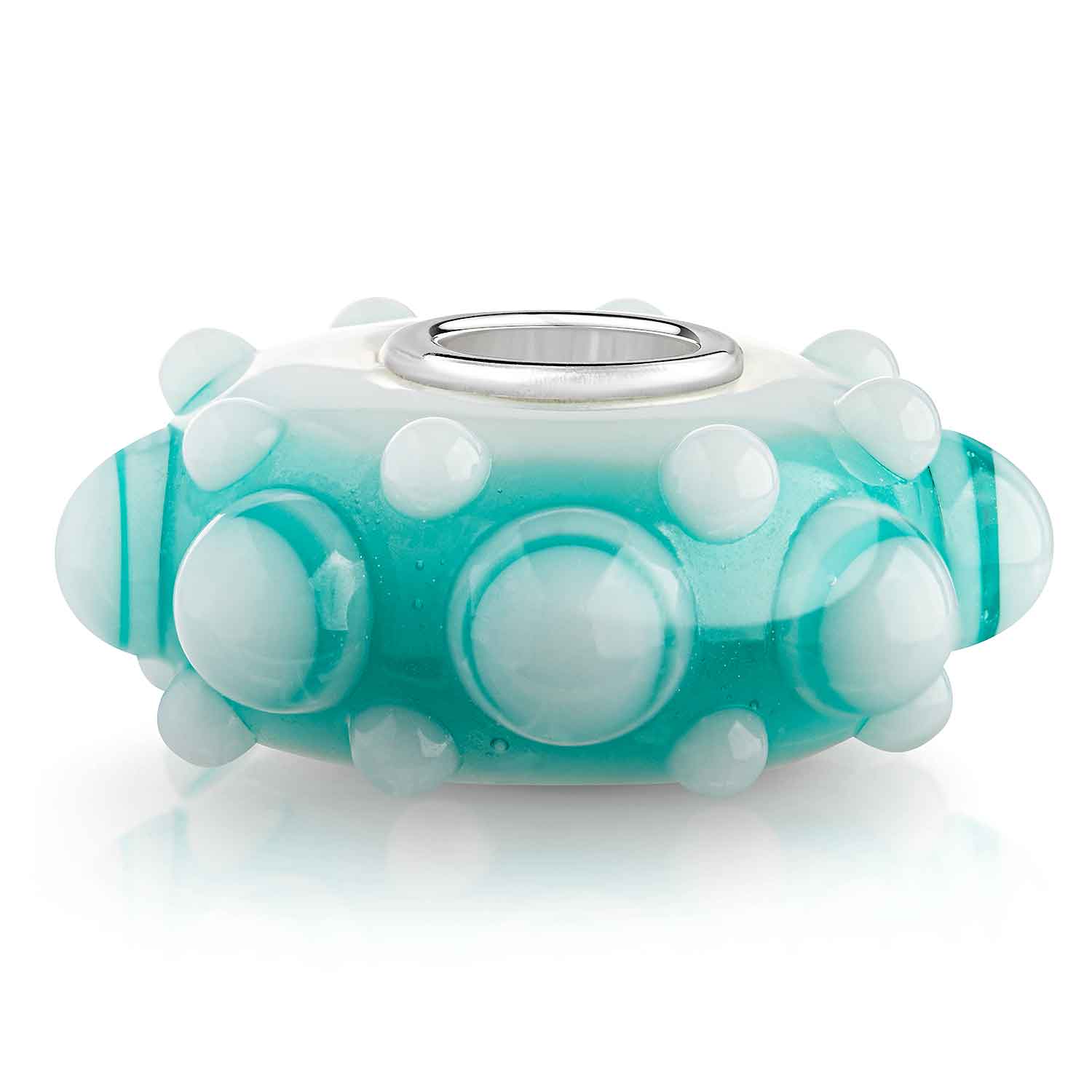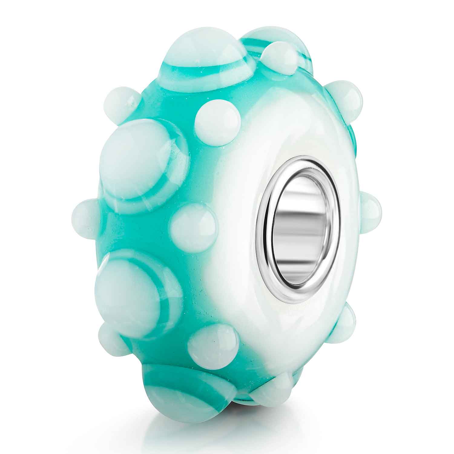 Glas Bead in ausgefallener 3D Optik in Türkis und Weiß. Er ist zusätzlich mit einer Hülse aus massivem 925 Sterling Silber ausgestattet. Der Bead ist passend zu allen gängigen Beads Armbändern und Ketten bis max. 4,4mm Breite/ Durchmesser und ist daher auch besonders für alle gängigen großen Beads Marken geeignet.