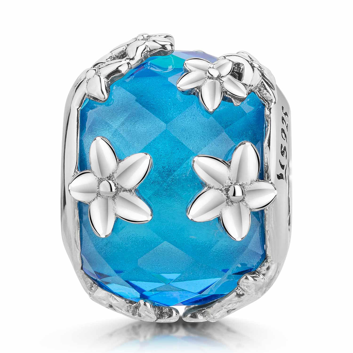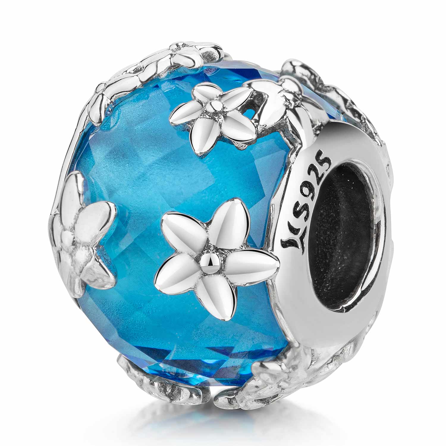 Wunderschöner Bead mit Blumen aus 925 Sterling Silber und facettiertem blauem Glaskern. Der Glasbead ist für Beads Armbänder und Ketten bis max 4,4mm Durchmesser geeignet.