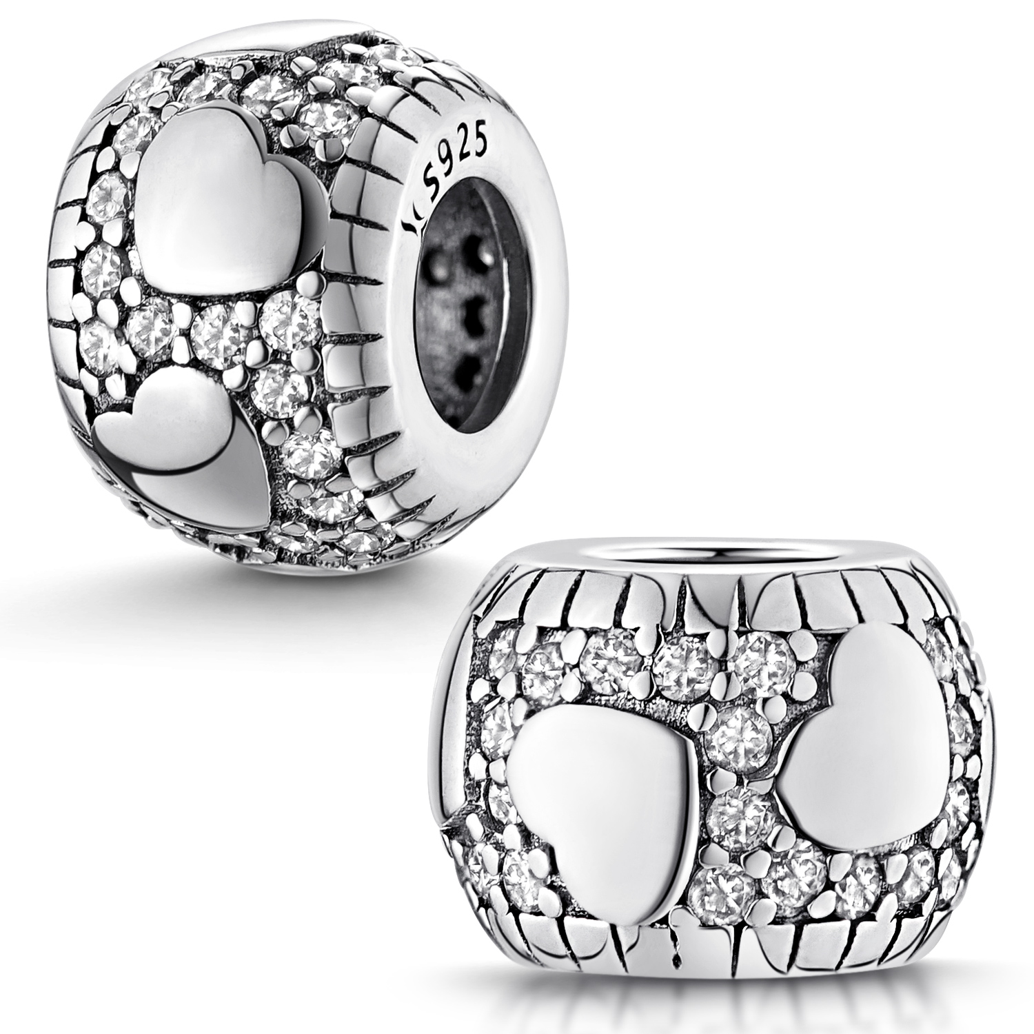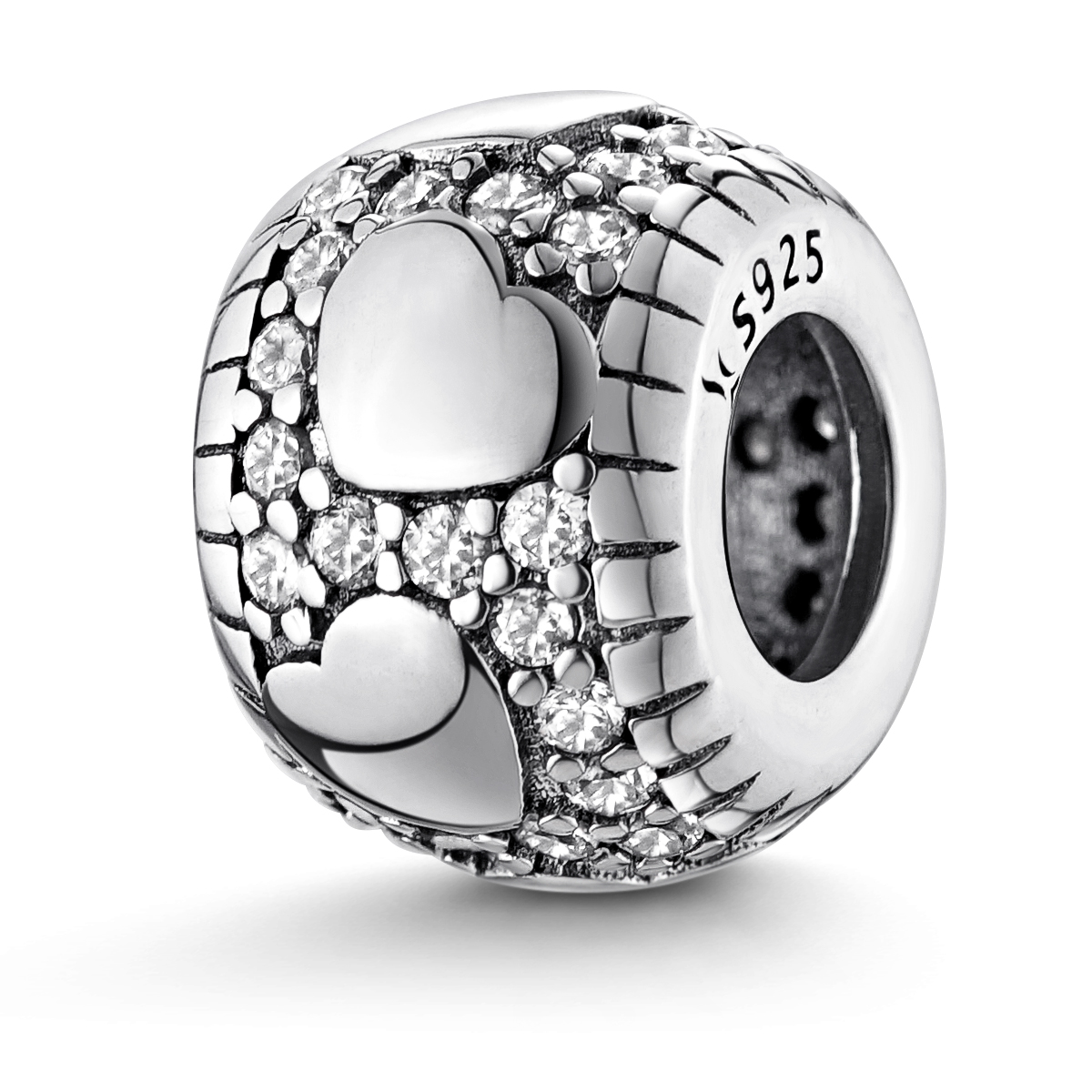 Runder Bead aus massivem 925 Sterling Silber verziert mit Herzen und zahlreichen weißen Zirkonia Steinen. Der kleine Anhänger ist passend zu allen gängigen Bead Armbändern und Ketten bis max. 4,4mm Stärke.