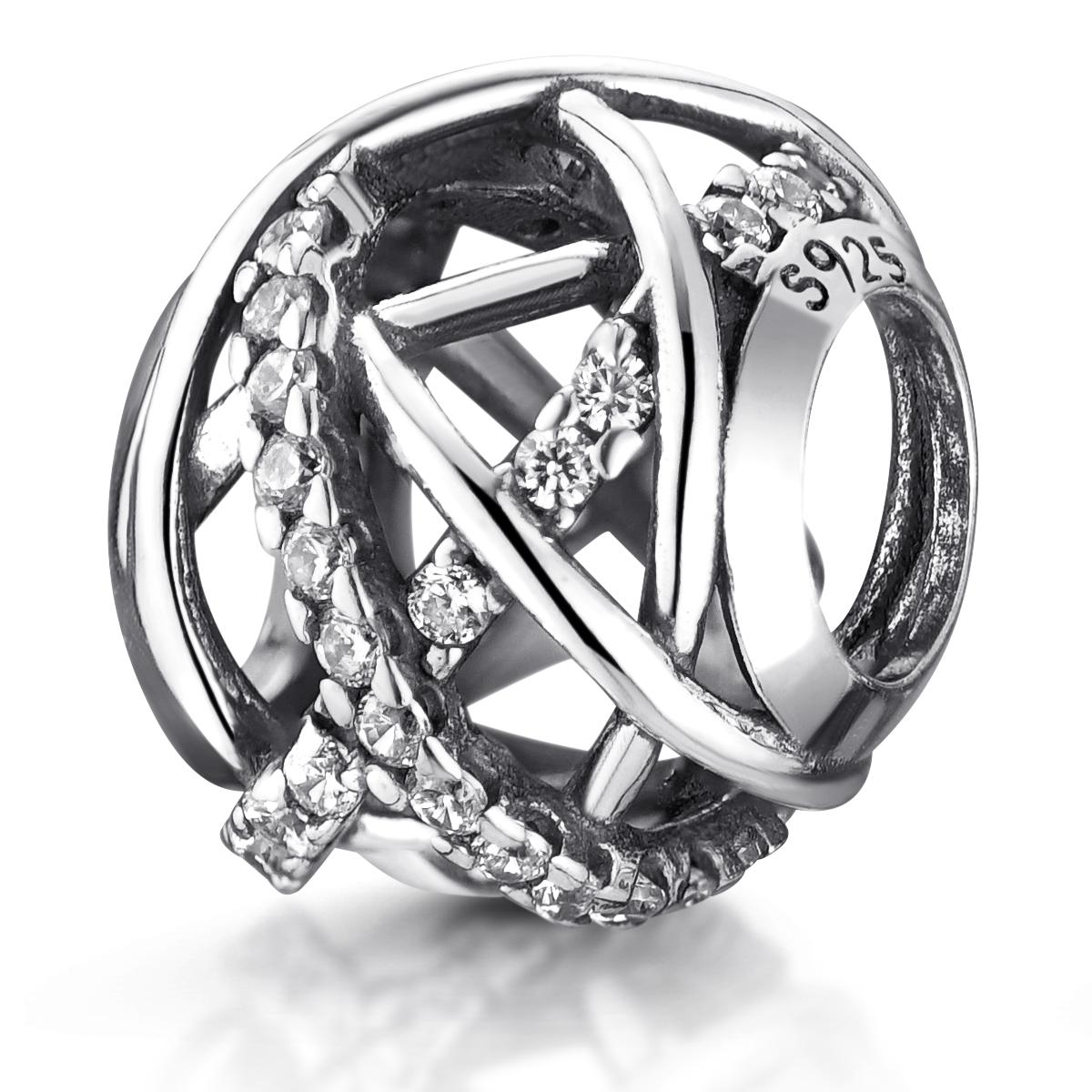 Runder Bead aus massivem 925 Sterling Silber verziert mit zahlreichen weißen Zirkonia Steinen in Netzform. Der kleine Anhänger ist passend zu allen gängigen Bead Armbändern und Ketten bis max. 4,4mm Stärke.