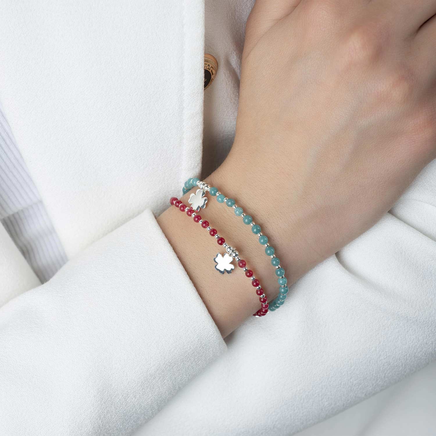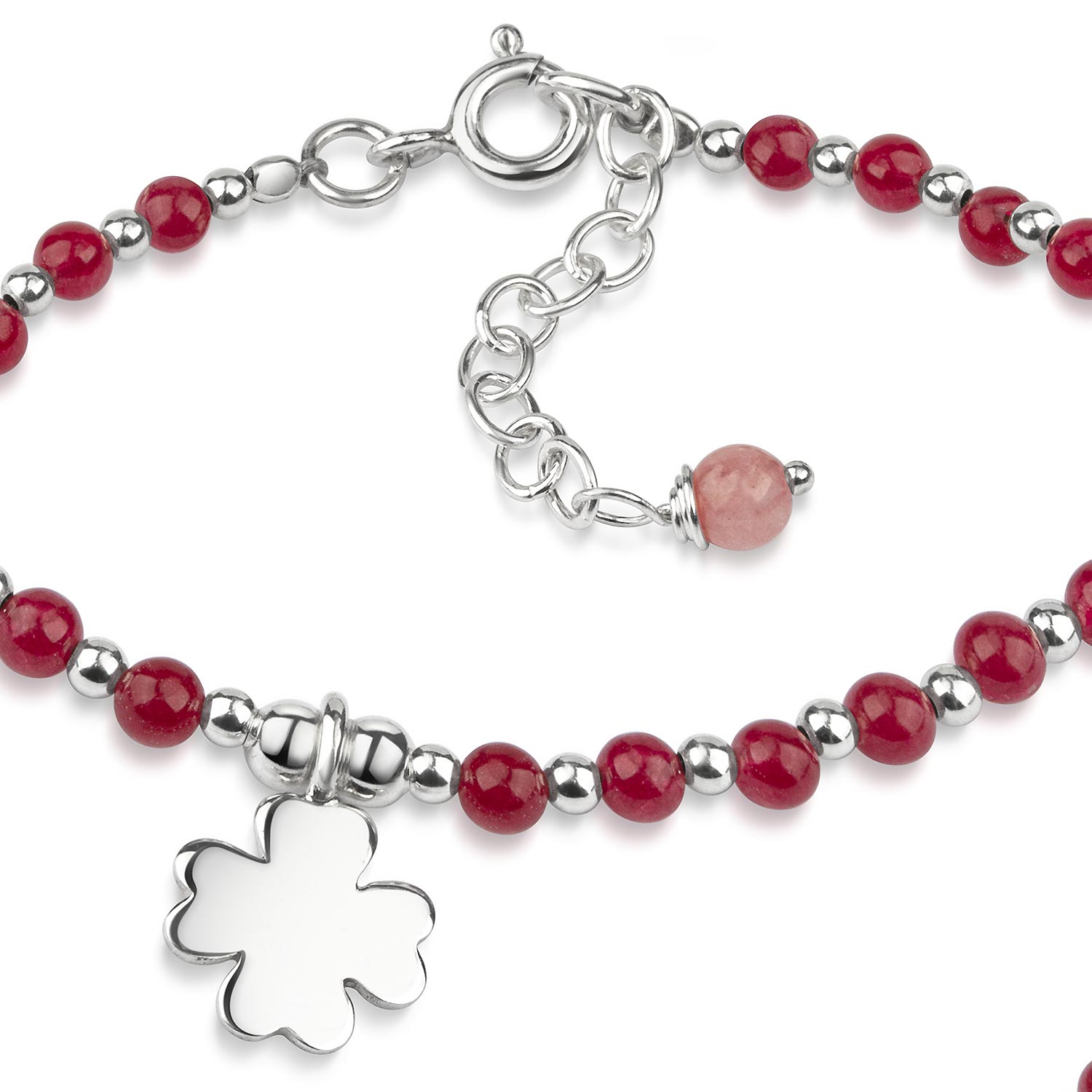 Edles Armband mit rosa-roten Achat Edelsteinen und 925 Silber Kleeblatt Anhänger.