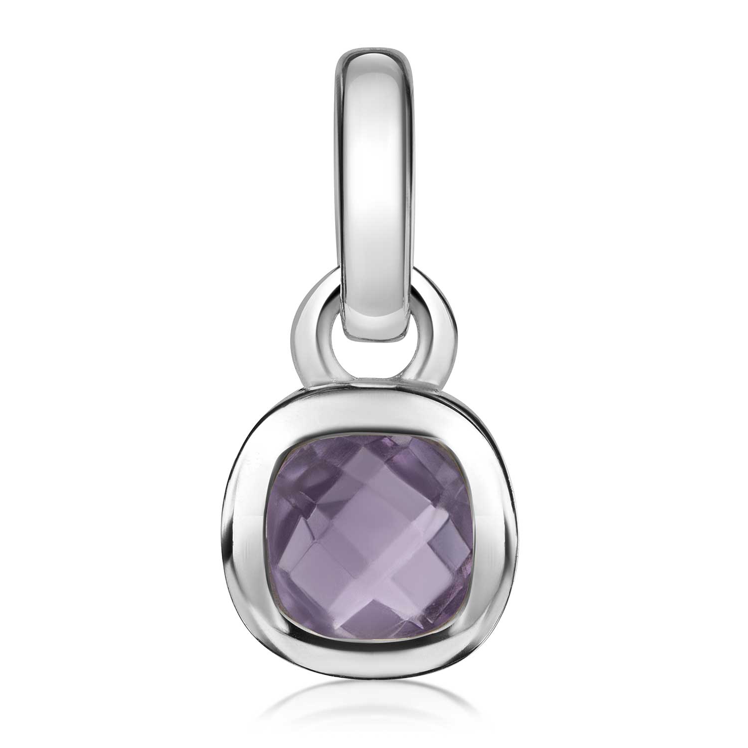 Quadratischer Kettenanhänger aus 925 Sterling Silber mit einem facettierten Amethyst. Wahlweise mit einer passenden Ankerkette erhältlich.