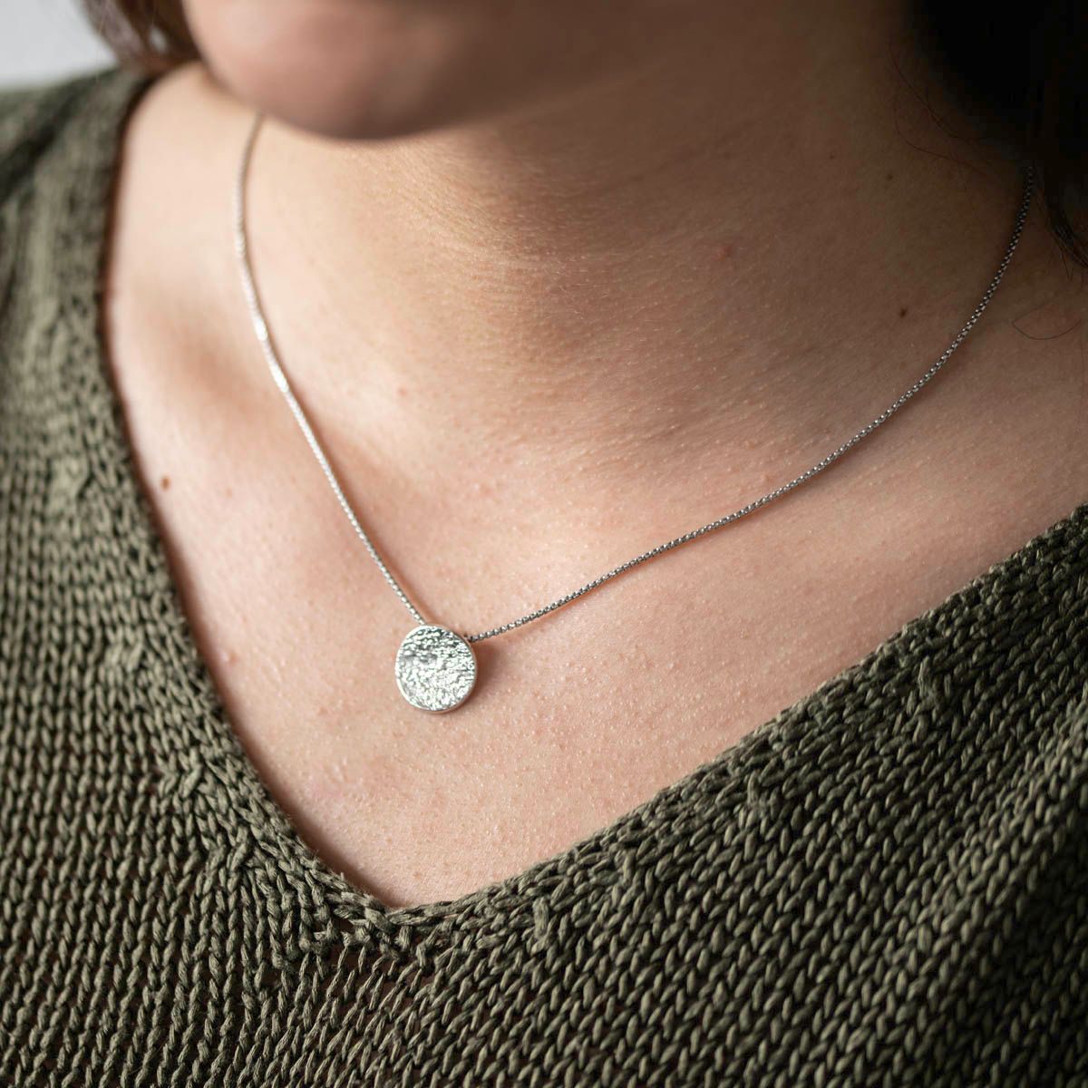 Runder Kettenanhänger in gewölbter Form mit gehämmerter Oberfläche aus 925 Sterling Silber. Der Anhänger ist wahlweise mit einer passenden Ankerkette im Set erhältlich.
