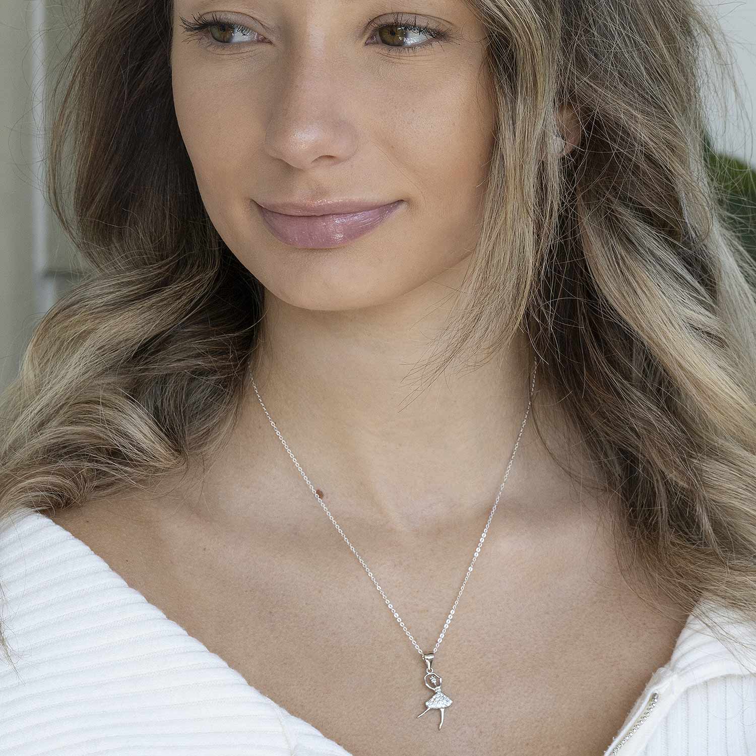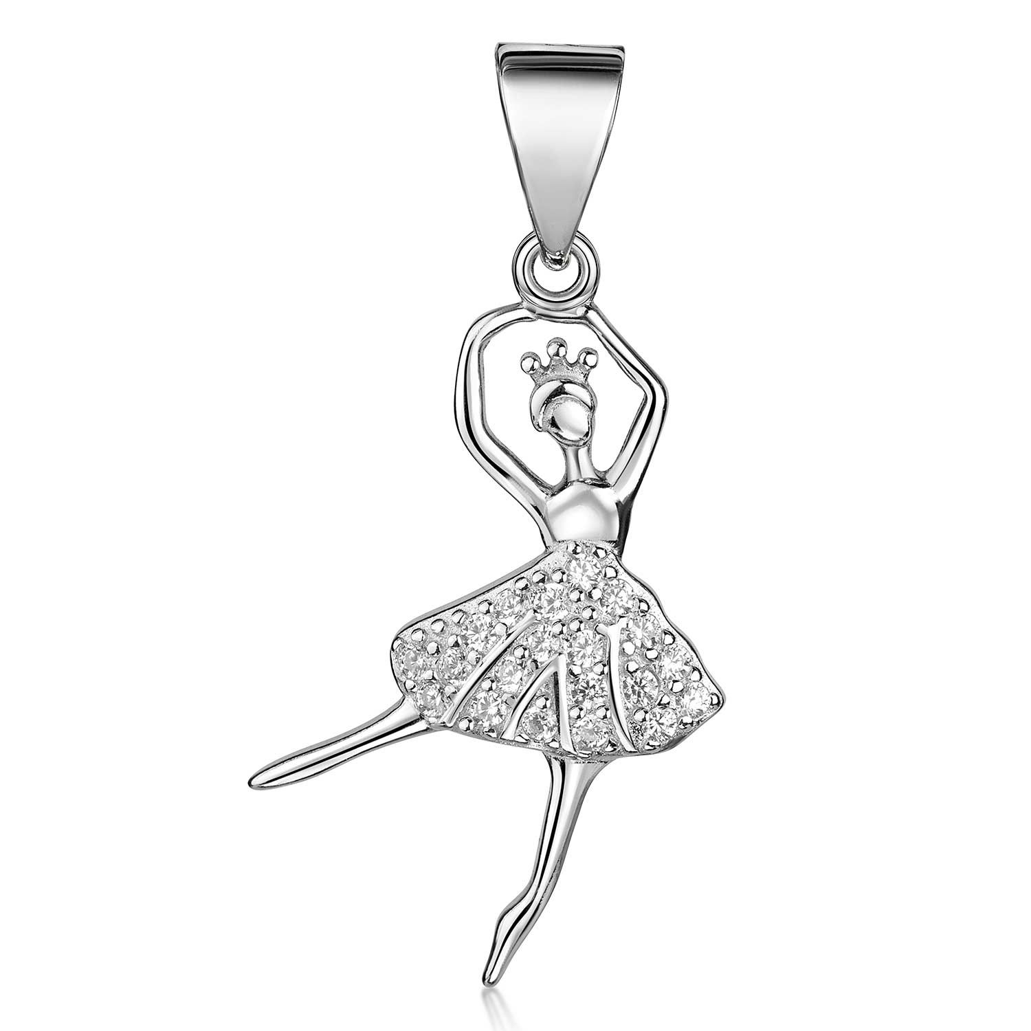 Funkelnder Anhänger in Form einer Tänzerin aus 925 Sterling Silber mit weißen Zirkonia Steinen. Der Kettenanhänger ist wahlweise mit einer passenden Ankerkette im Set erhältlich.