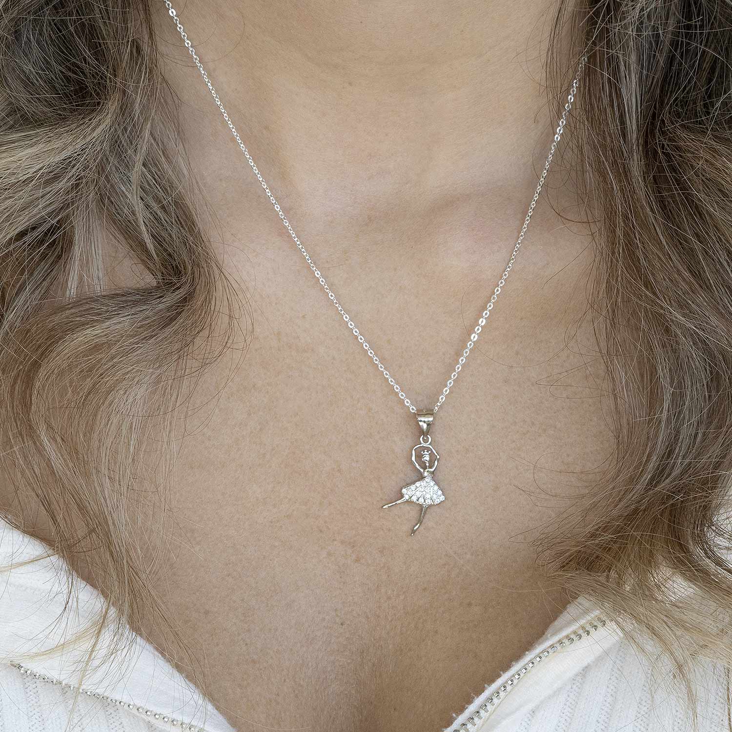 Zarter Anhänger in Form einer Tänzerin aus 925 Sterling Silber. Weiße Zirkonia Steinchen auf dem Rock der Tänzerin verleihen dem Schmuckstück ein zartes Funkeln. Der Kettenanhänger ist passend für alle Ketten bis zu einer maximalen Stärke von 3,6mm und wahlweise im Set mit einer passenden Ankerkette in verschiedenen Länge erhältlich.