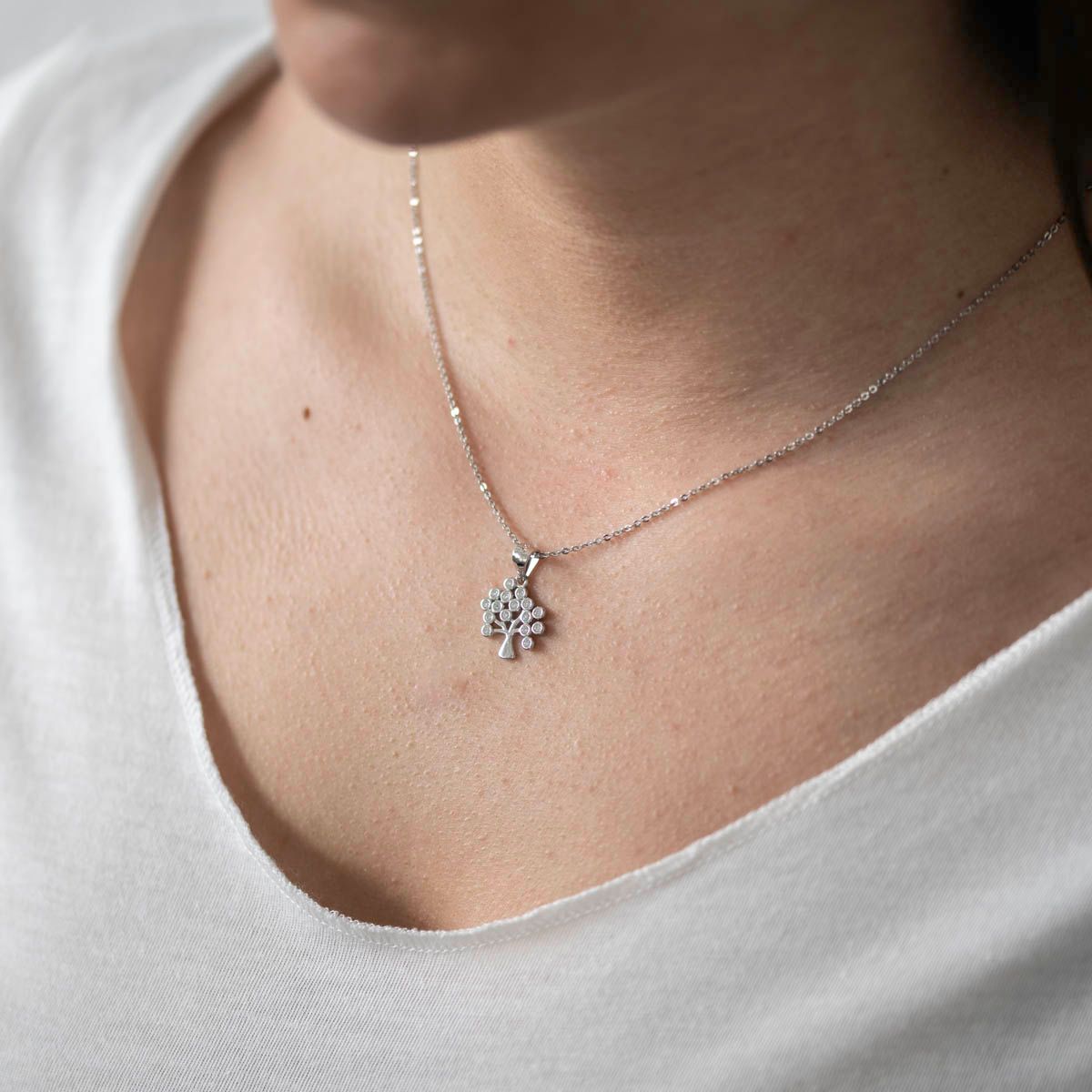 Unser Damen Anhänger im Design eines Baumes ist aus 925 Sterling Silber gefertigt und mit Rhodium beschichtet, um ihn vor dem Anlaufen zu schützen. Die Äste des Lebensbaumes wurden mit 16 weißen Zirkonia Steinen verziert, die wie Blüten oder Früchte wirken. Der Schmuckanhänger ist passend für alle Ketten bis zu einer maximalen Stärke von 3mm.