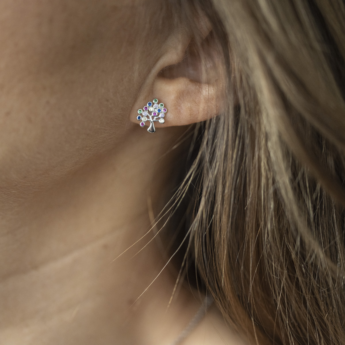 Farbenfrohe Ohrstecker in Form eines Baumes aus rhodiniertem 925 Sterling Silber mit bunten Zirkonia Steinen.