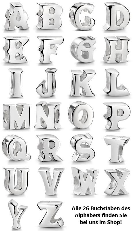 Dieser Silber Buchstabe / Alphabet wurden aus massiven 925 Sterling Silber gefertigt und im Anschluss hochglanzpoliert. Der Bead Anhänger eignet sich Ideal als Geschenk z.B. für Freundschafts-Armbänder oder als Herrenschmuck. Er ist passend zu allen gängigen Beads-Armbändern oder -Ketten bis max. 4,4mm Breite, besonders zu den bekanntesten Bead-Marken auf dem derzeitigen Markt.