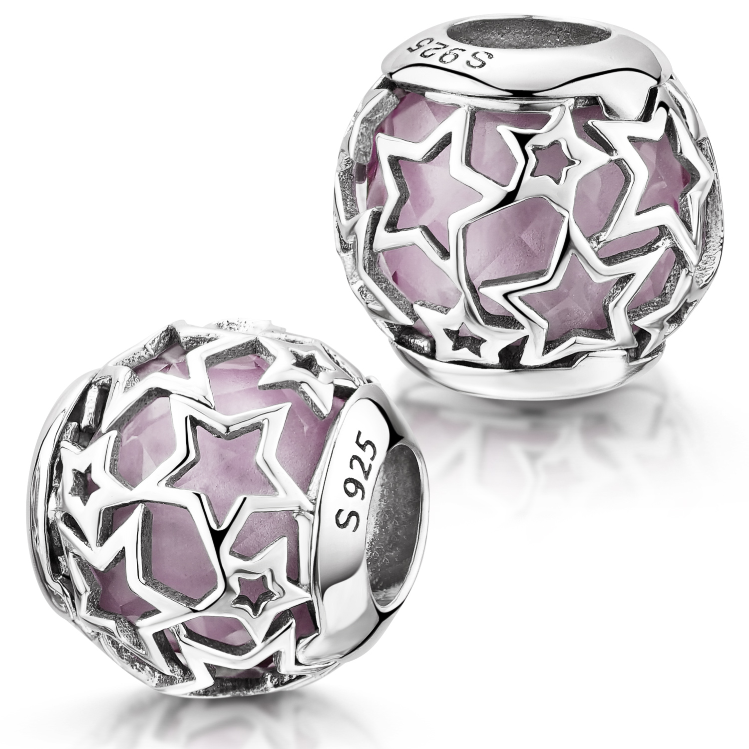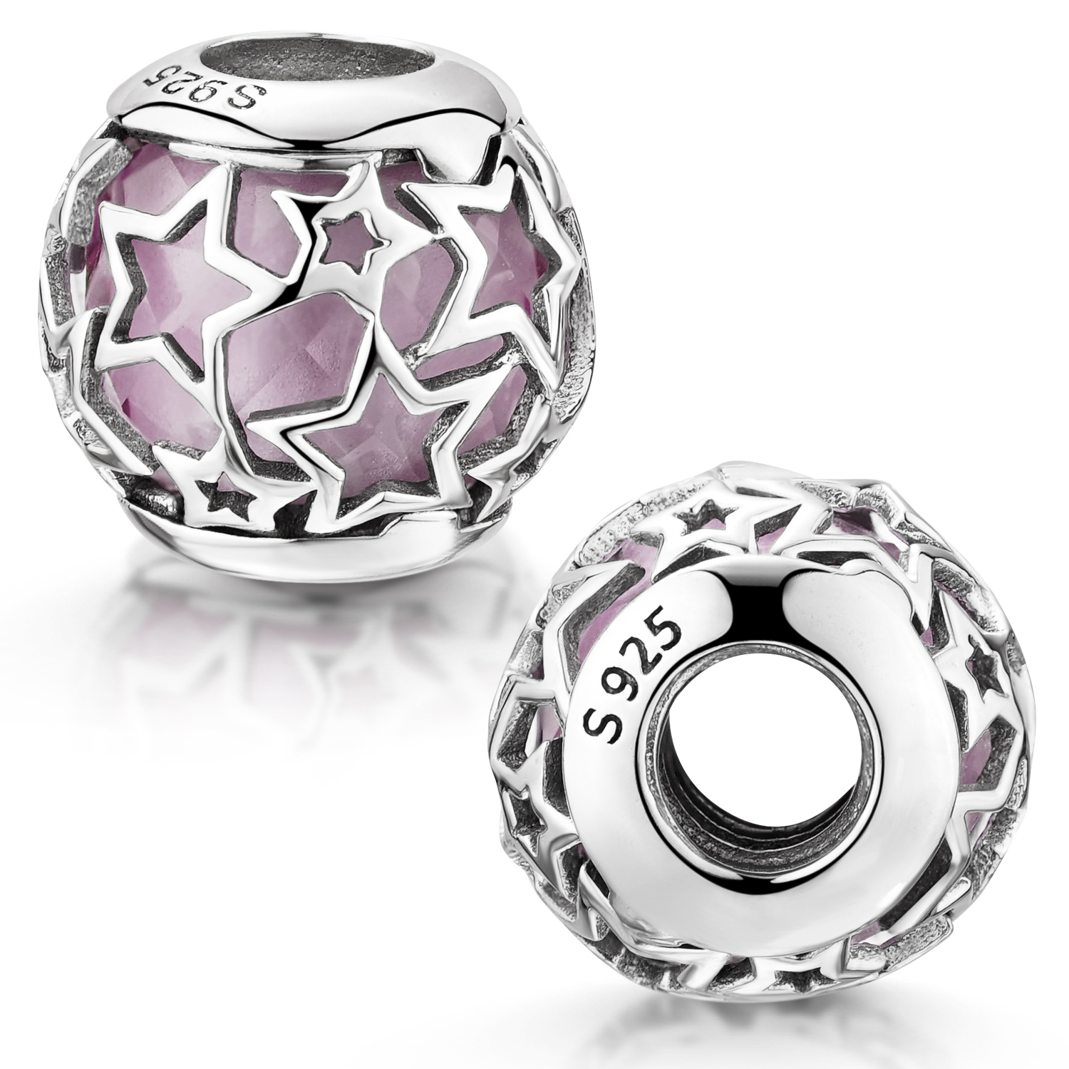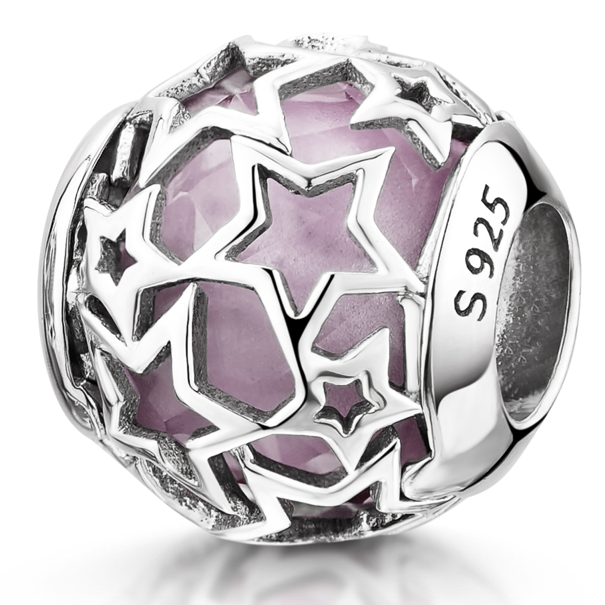 Wunderschöner Bead mit ausgestanzten Sternen aus 925 Sterling Silber, in dessen Inneren sich eine facettierte Glasperle in Altrosa befindet. Die Hülse ist mit einem Gewinde ausgestattet, wodurch dieser Charm auch als Stopper eingesetzt werden kann. Er ist kompatibel mit Beads Armbändern mit Gewinde.