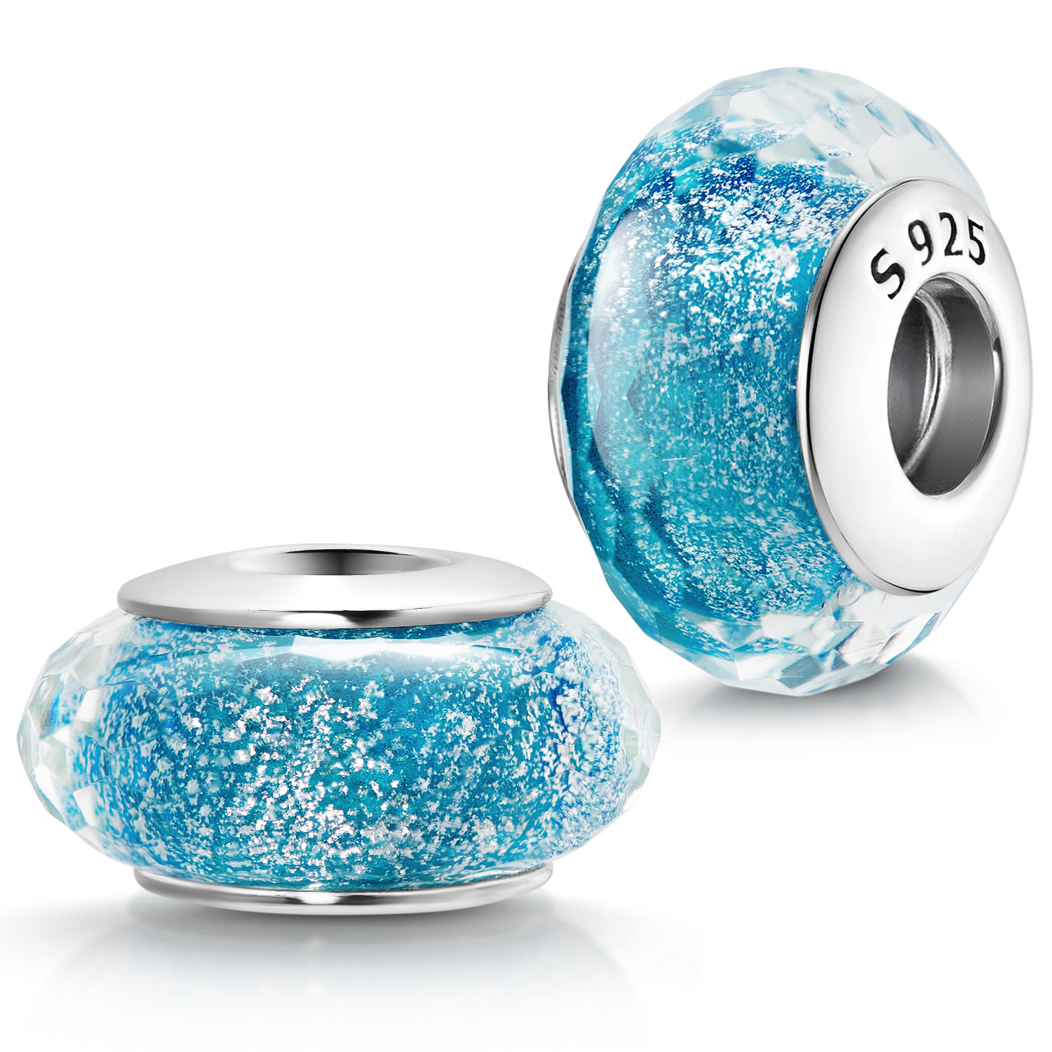 Hellblauer Glas Bead mit einer breiten und massiven 925 Sterling Silber Hülse. Der Facettenschliff und Schimmerpartikel im Glasinneren erzeugen zudem einen dezenten Glitzereffekt.