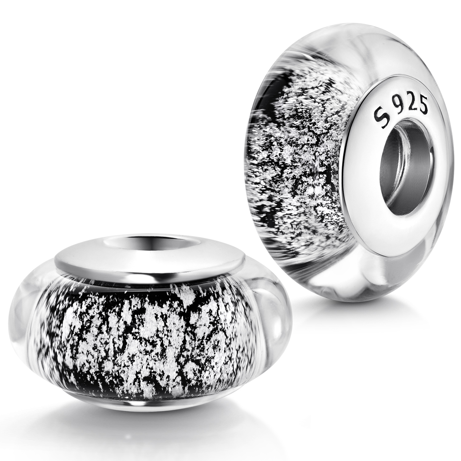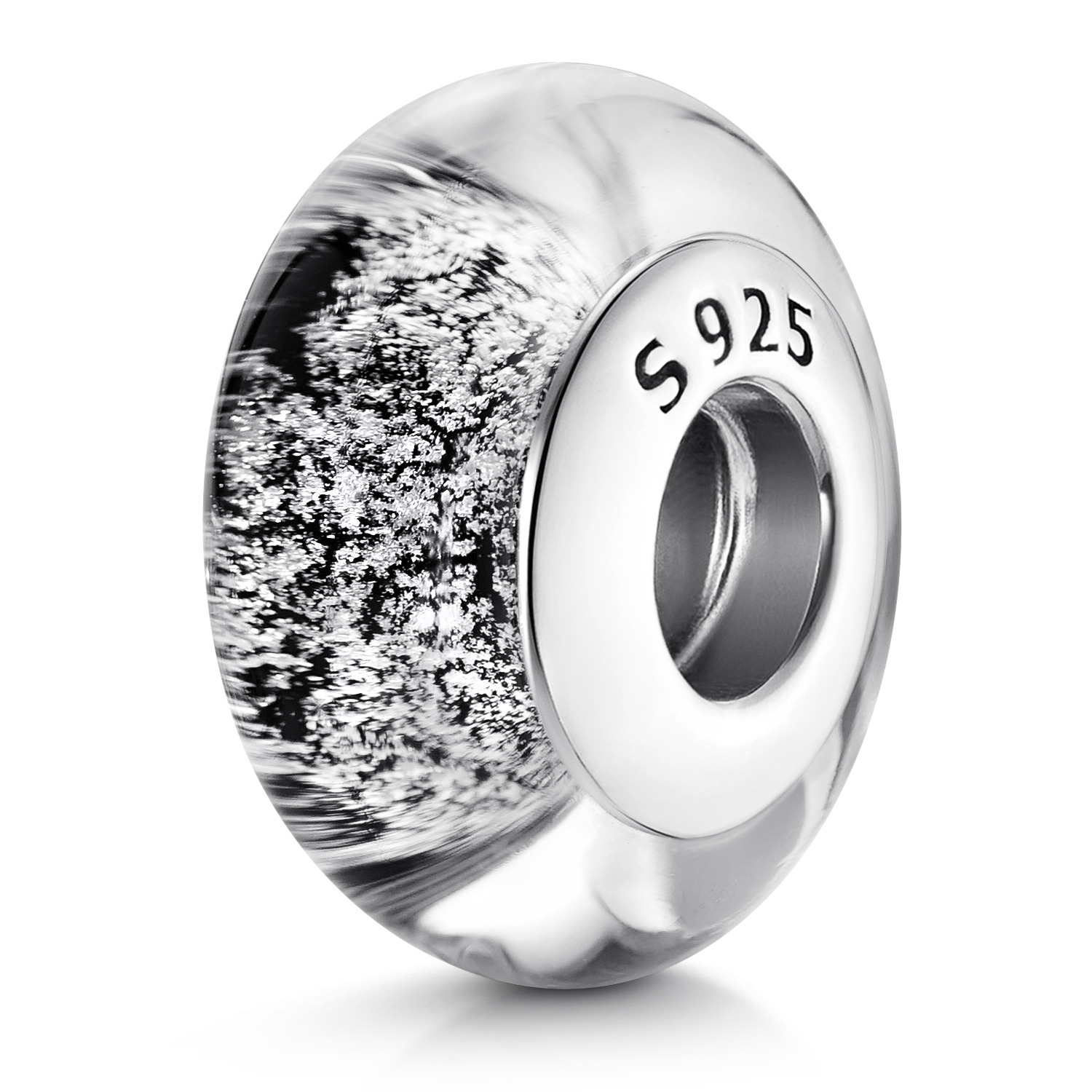 Großer schwarzer Glas Bead silber gesprenkelt. Das Besondere an dieser Glasperle ist die breite und massive 925 Sterling-Silber Hülse, welche passend für Armbänder oder Ketten bis 4,4mm ist.