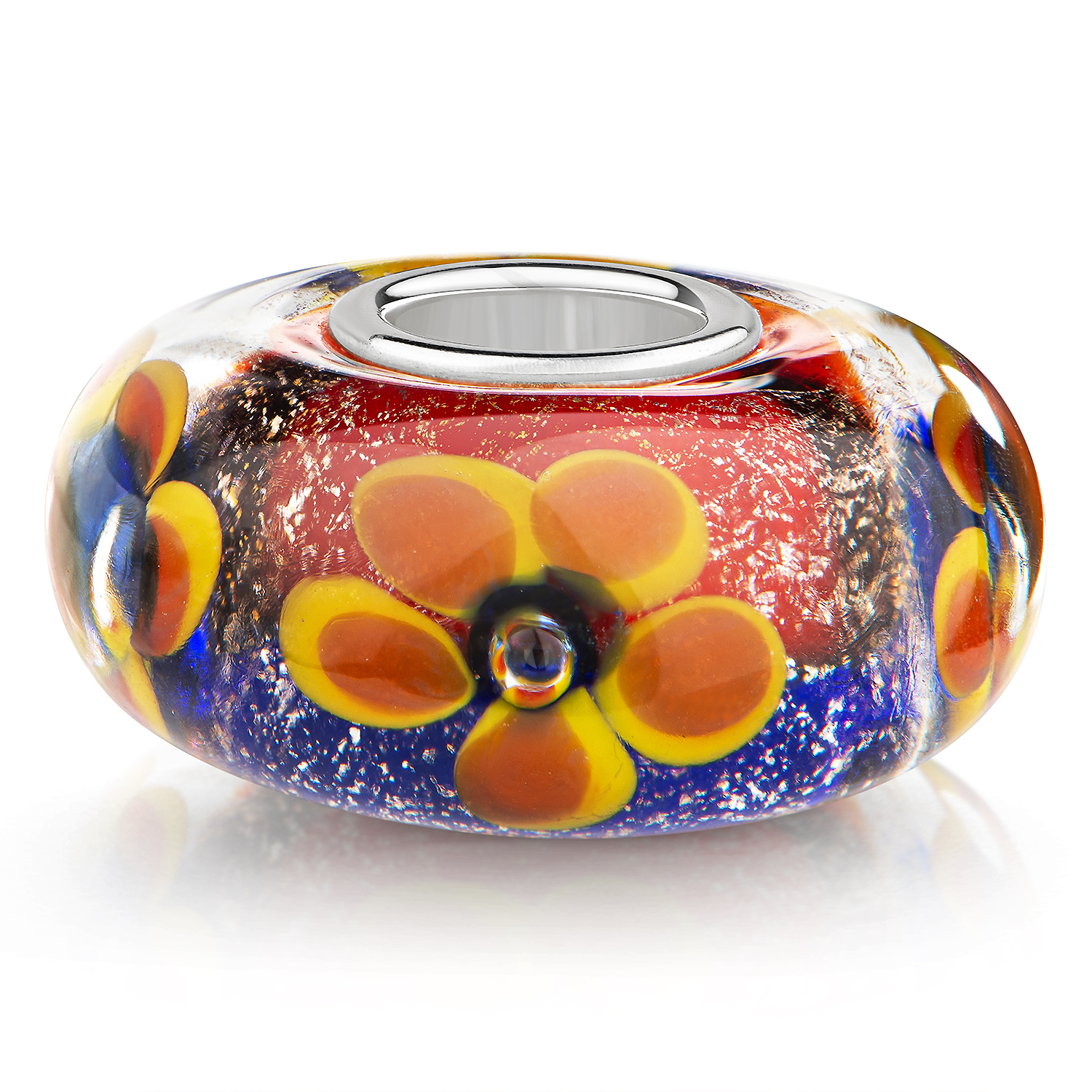 Farbenfroher Bead aus Glas mit gelb / orangenen Sonnenblumen Motiven auf blauem und rotem Hintergrund. Der Bead passt auf Armbänder aller gängigen Bead Markenarmbänder und Ketten bis 4,4mm Stärke.