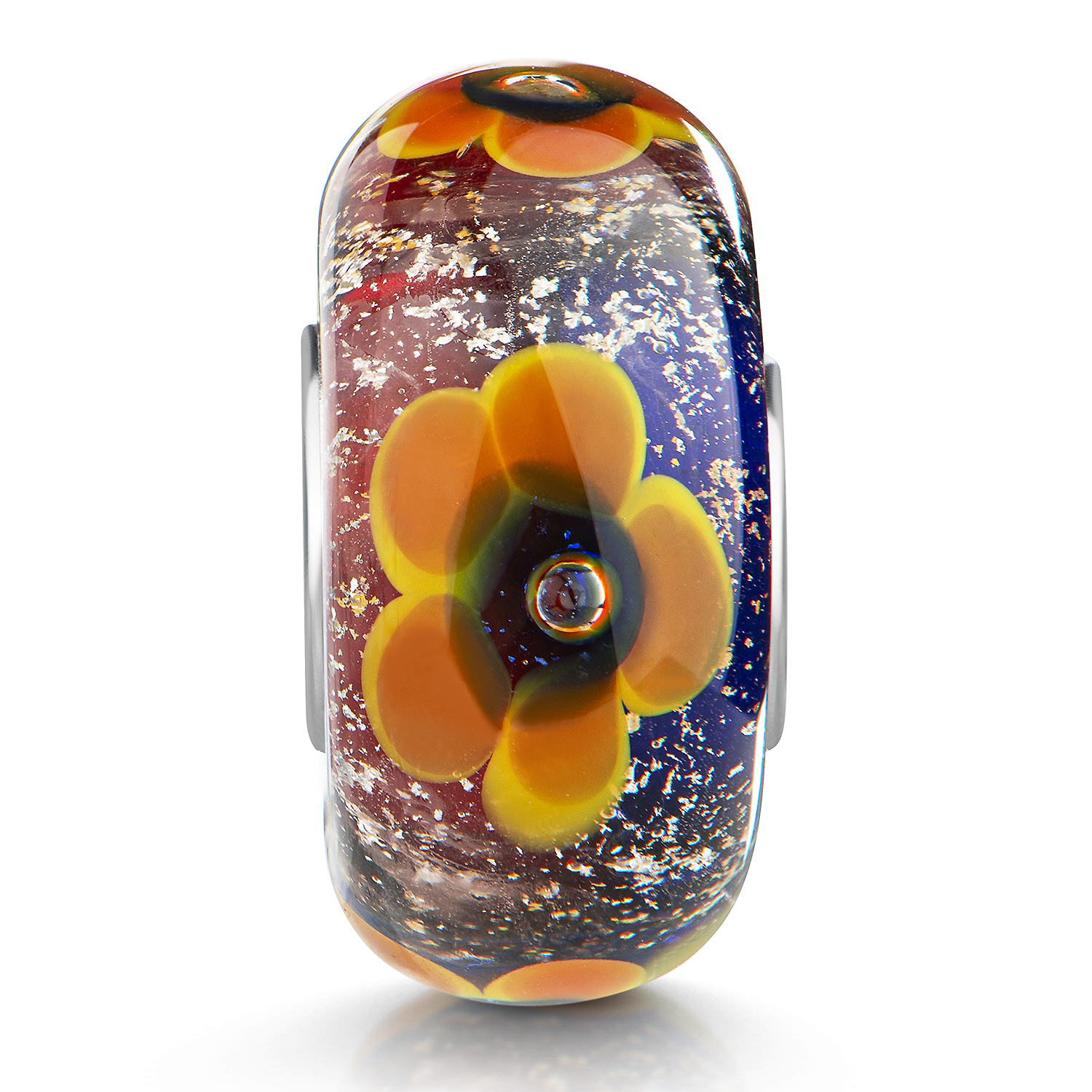 Lassen Sie sich von diesem kontrastreichen Glas Bead mit Sonnenblumen Motiven in gelb und orange auf rot / blauem Untergrund in gute Laune versetzen! Zusätzlich sorgen kleine Silberpartikel im Glasinneren für ein leichtes Glitzern. Die Hülse der Glasperle ist aus 925 Sterling Silber gearbeitet. Das Element ist passend zu allen gängigen Beads Armbändern und Ketten bis max. 4,4mm Breite und ist daher für viele Marken Beads geeignet.
