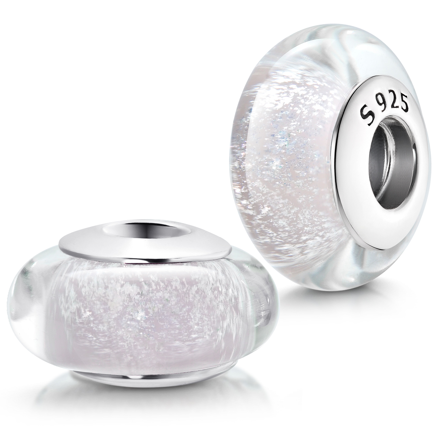 Großer weißer Glas Bead mit zartem Schimmer im Glasinneren. Das Besondere an dieser Glasperle ist die breite und massive 925 Sterling-Silber Hülse, welche passend für Armbänder oder Ketten bis 4,4mm ist.