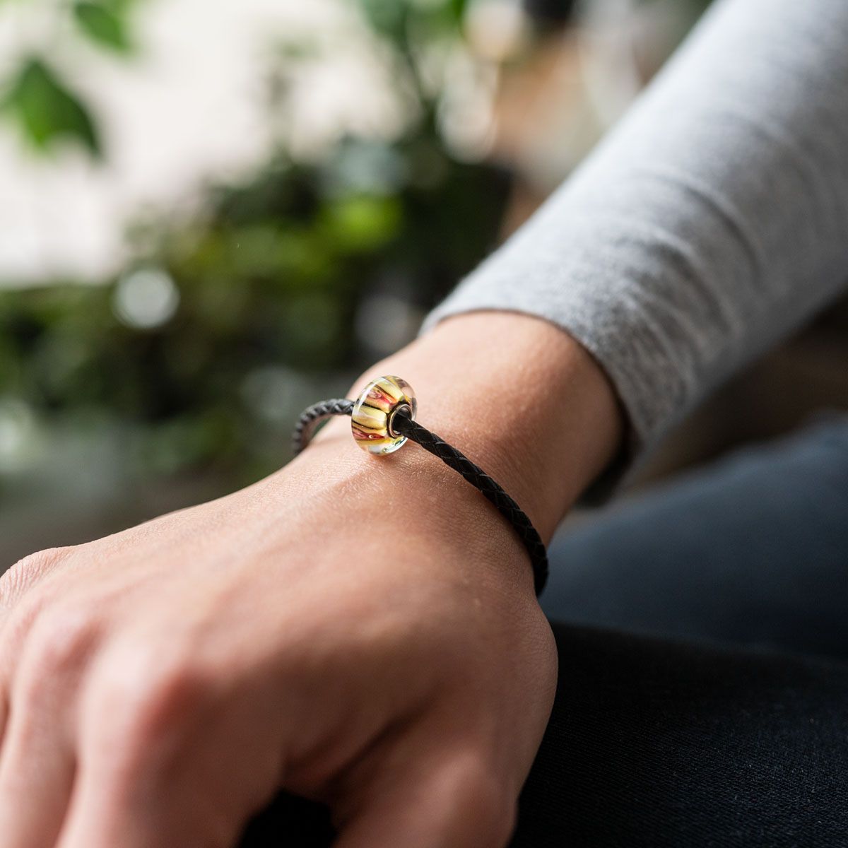 Zarter Glas Bead mit Streifen in Gelb, Rosa und Schwarz. Er ist zusätzlich mit einer 925 Silber Hülse ausgestattet. Das Glas Element ist passend zu allen gängigen Beads Armbändern und Ketten bis max. 4,4mm Breite und ist daher für alle Marken Beads geeignet.