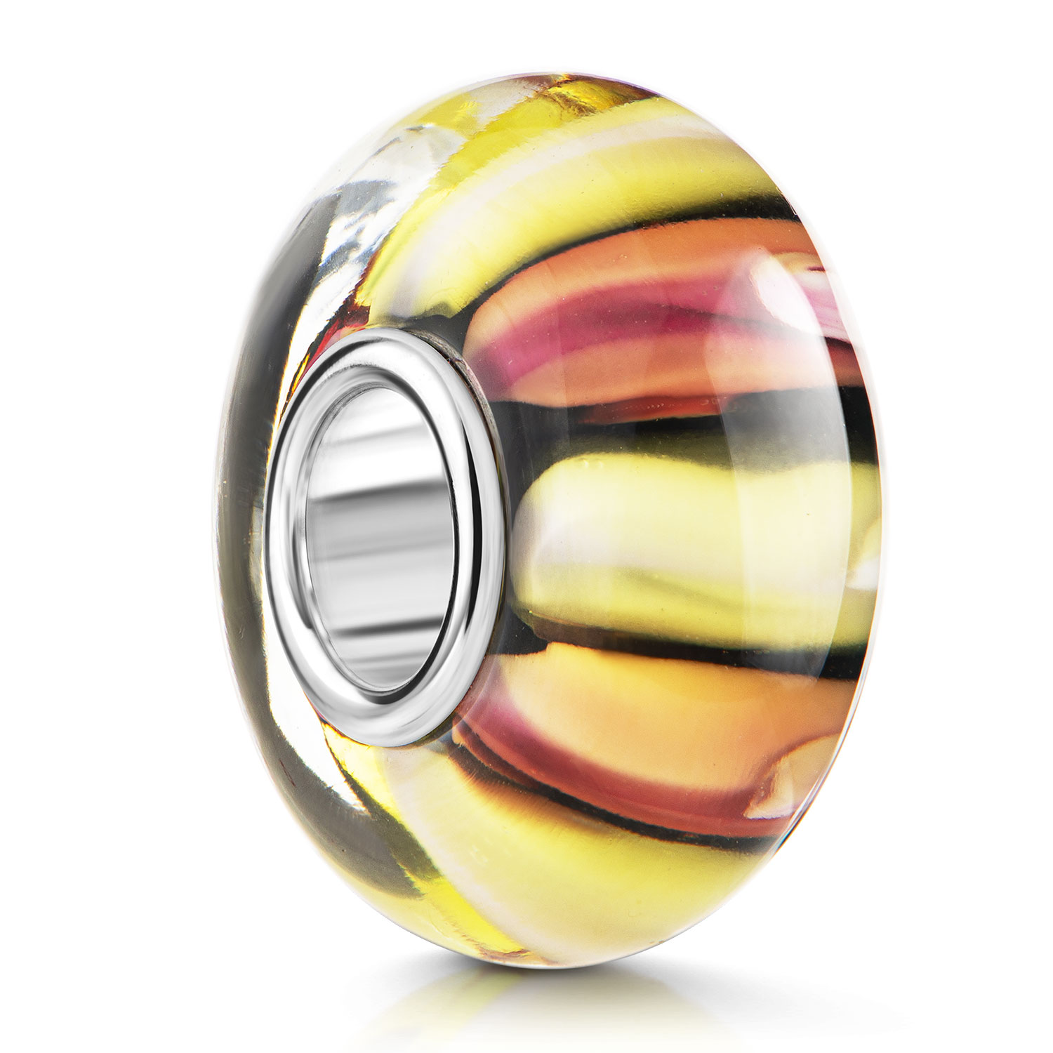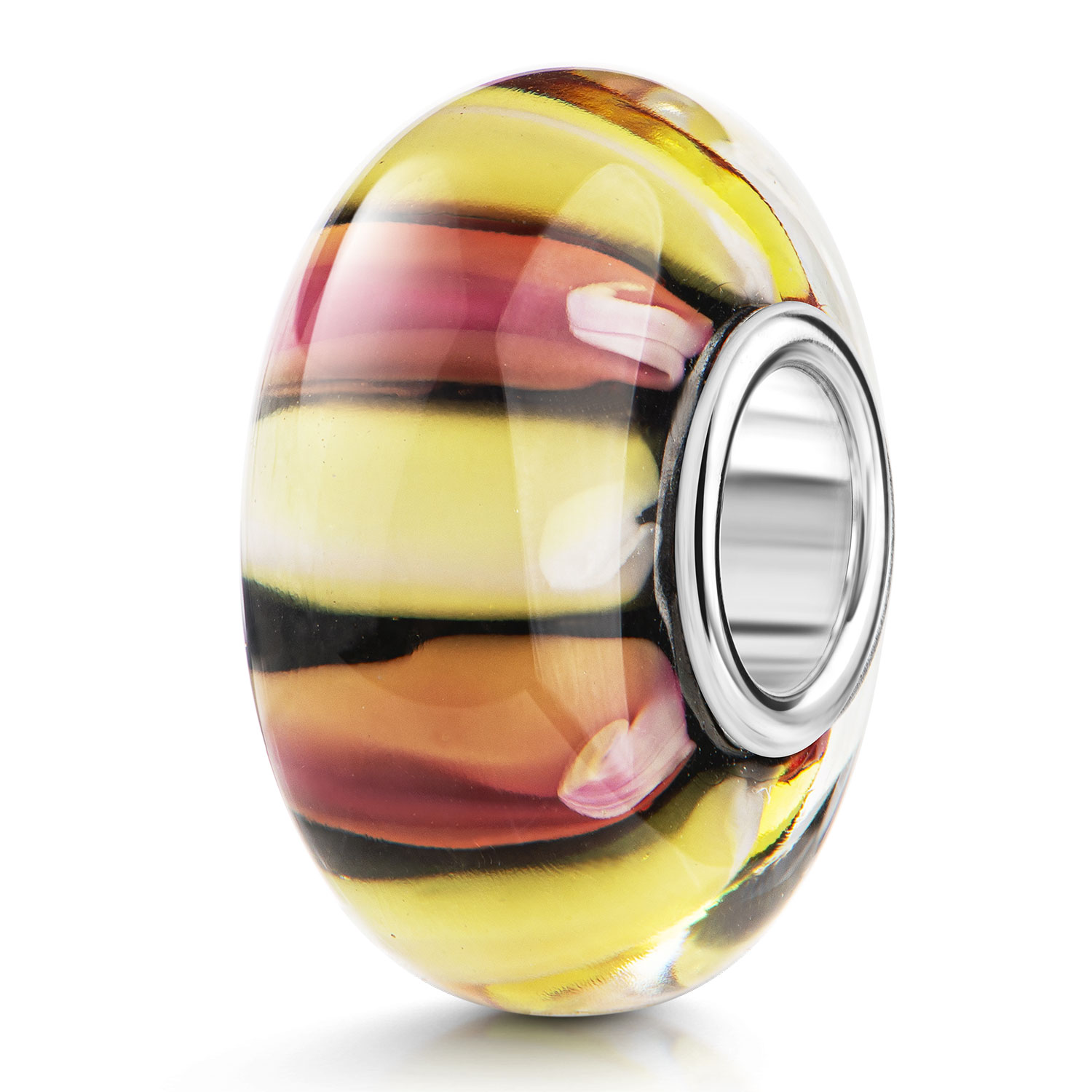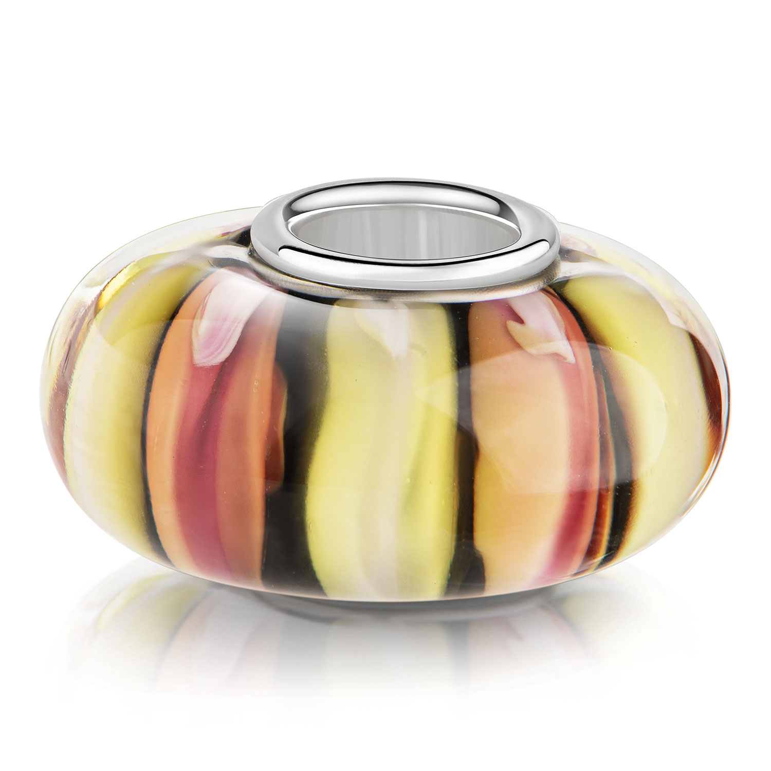 Gestreifter Glas Bead in Gelb und Rosa mit 925 Silber Hülse. Der Bead passt auf Armbänder aller gängigen Beads Markenarmbänder und Ketten bis 4,4mm Stärke.