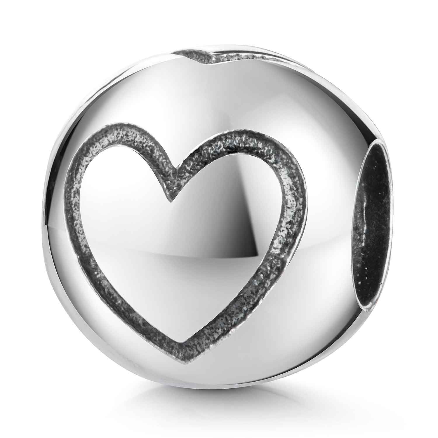 Kugelrunder Bead mit Herz Symbol aus reinem 925 Sterling Silber. Der kleine Charm Anhänger ist passend zu allen gängigen Bead Armbändern und Ketten bis max. 4,4mm Stärke.