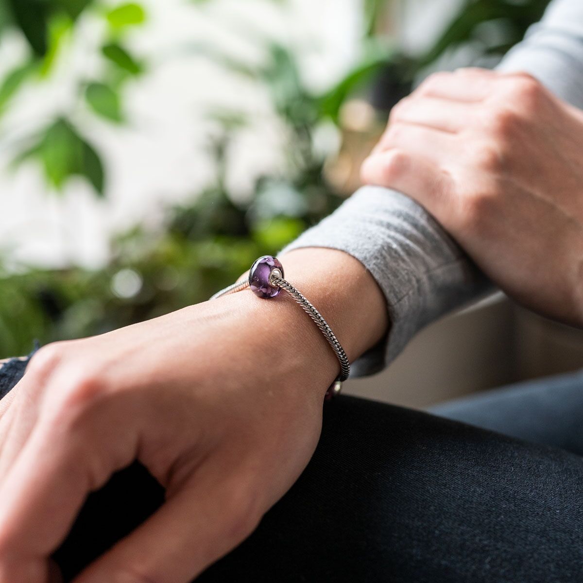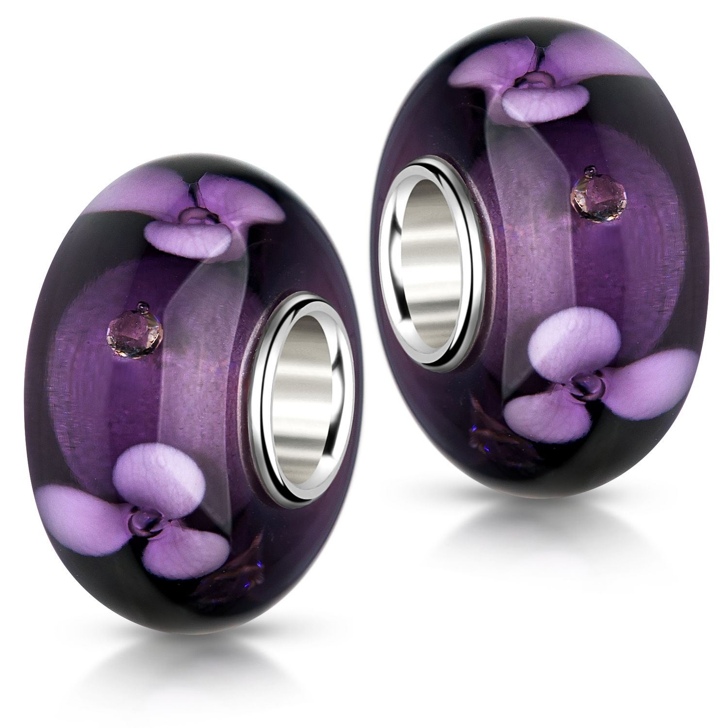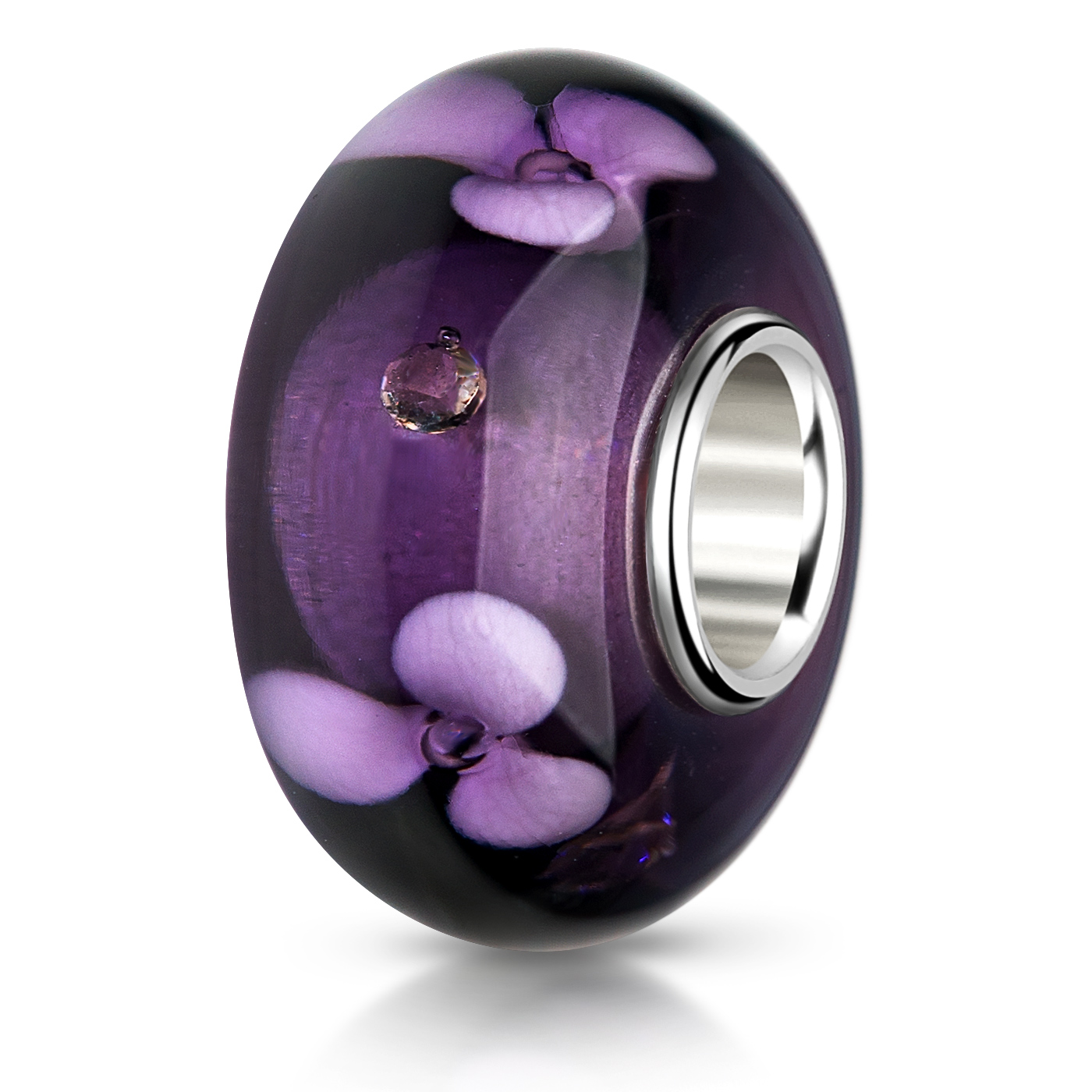 Glas Bead mit Blütenmotiven in Lila / Violett. Der Bead ist zusätzlich mit einer Hülse aus 925 Sterling Silber ausgestattet und mit 4 brillantgeschliffenen Zirkonia im Glasinneren besetzt. Dieser Bead ist passend zu allen gängigen Beads Armbändern und Ketten bis max. 4,4mm Durchmesser und ist daher auch besonders für alle gängigen großen Beads Marken geeignet.