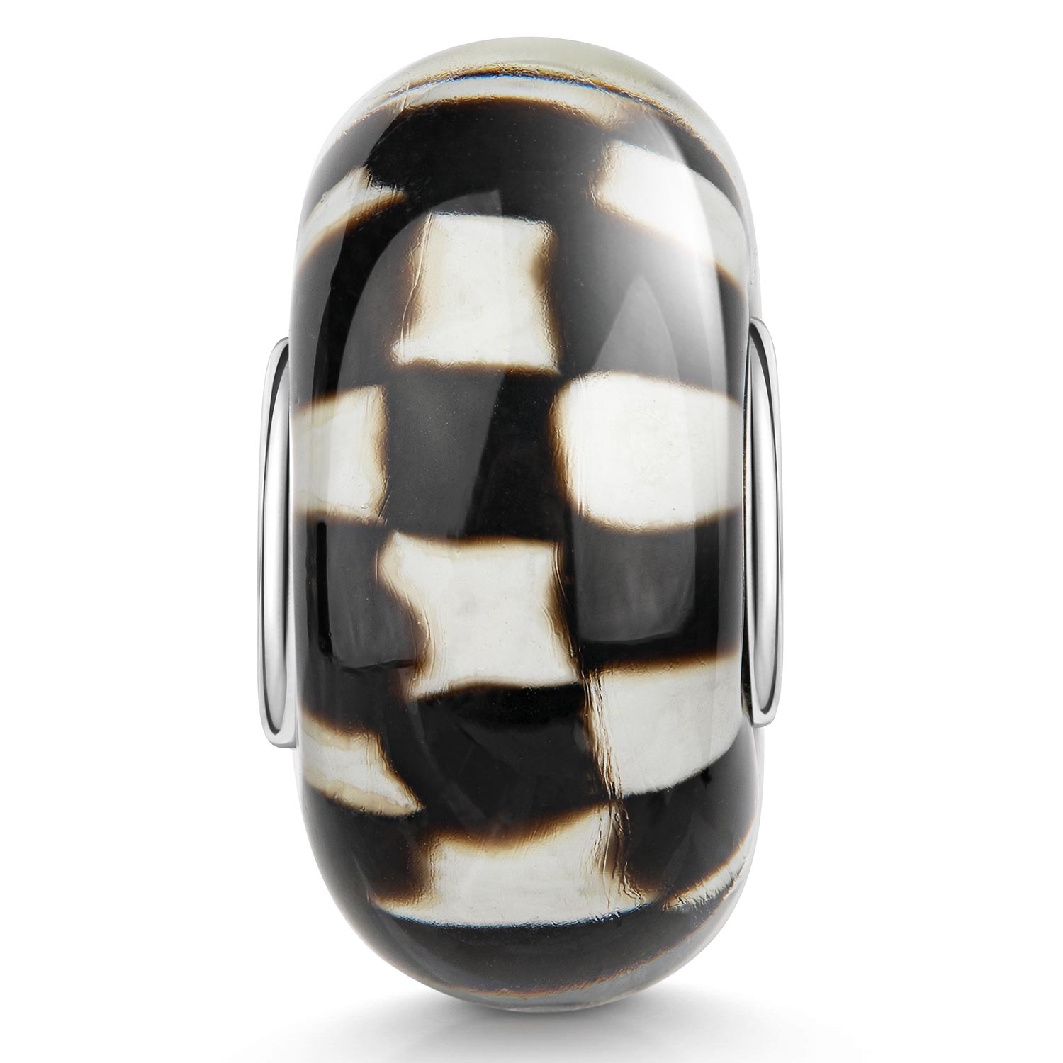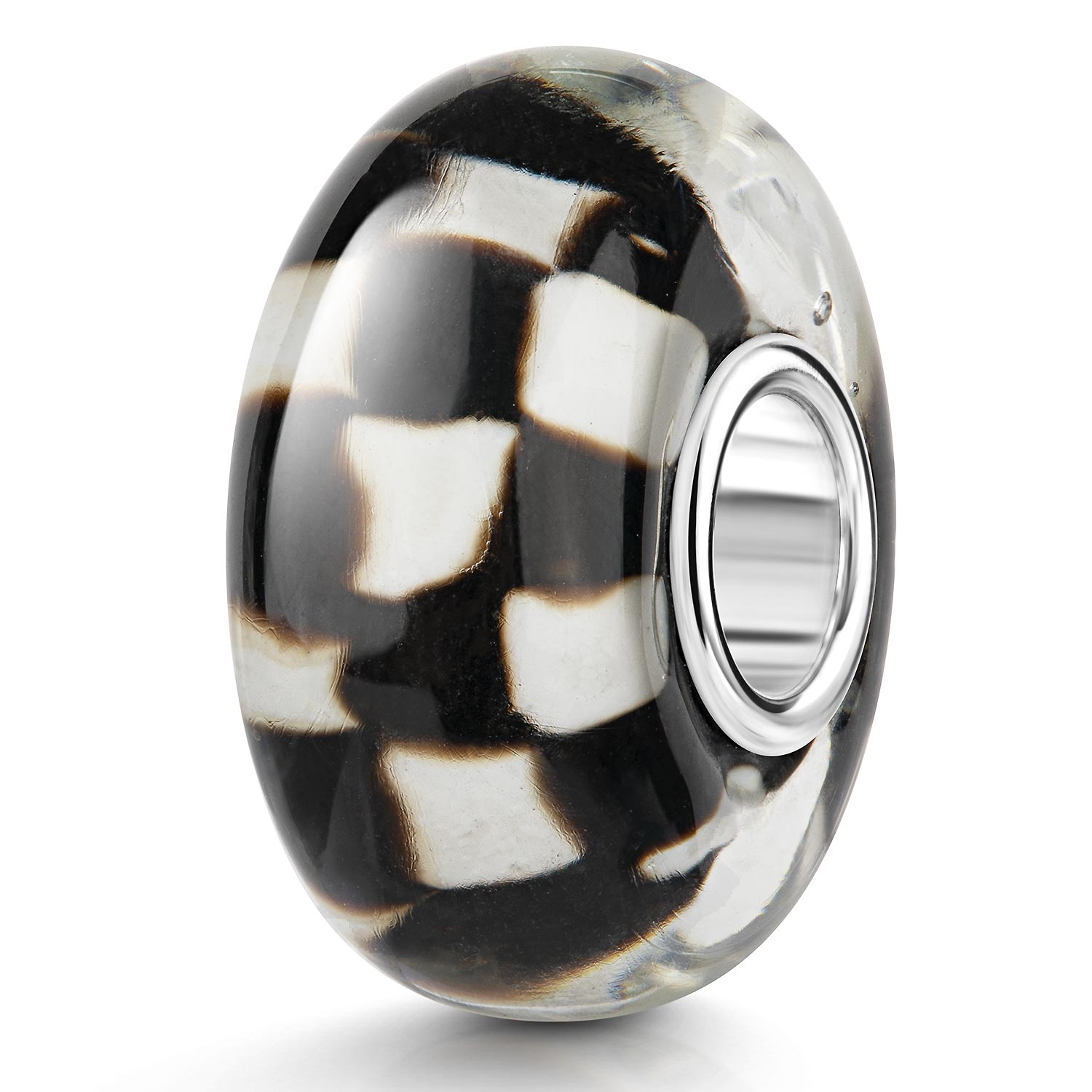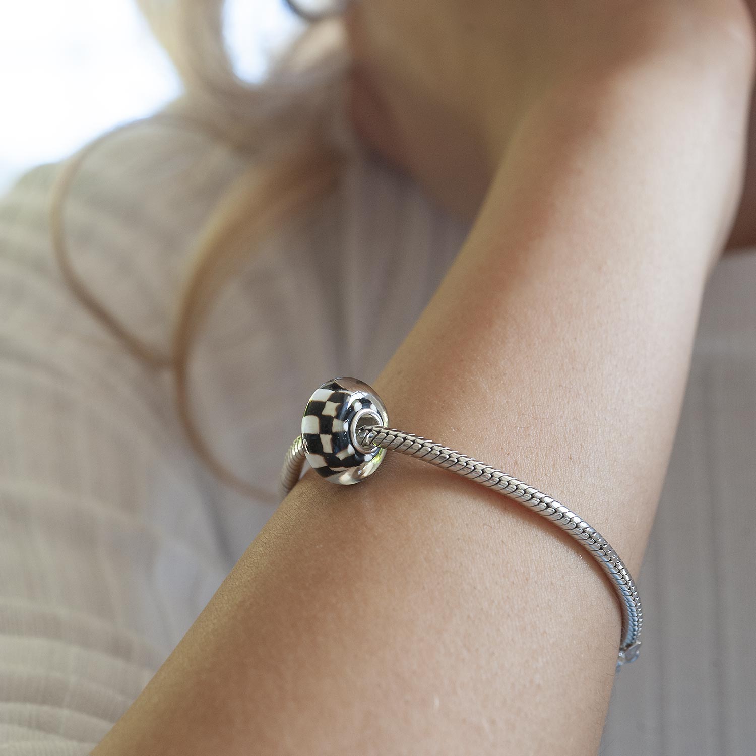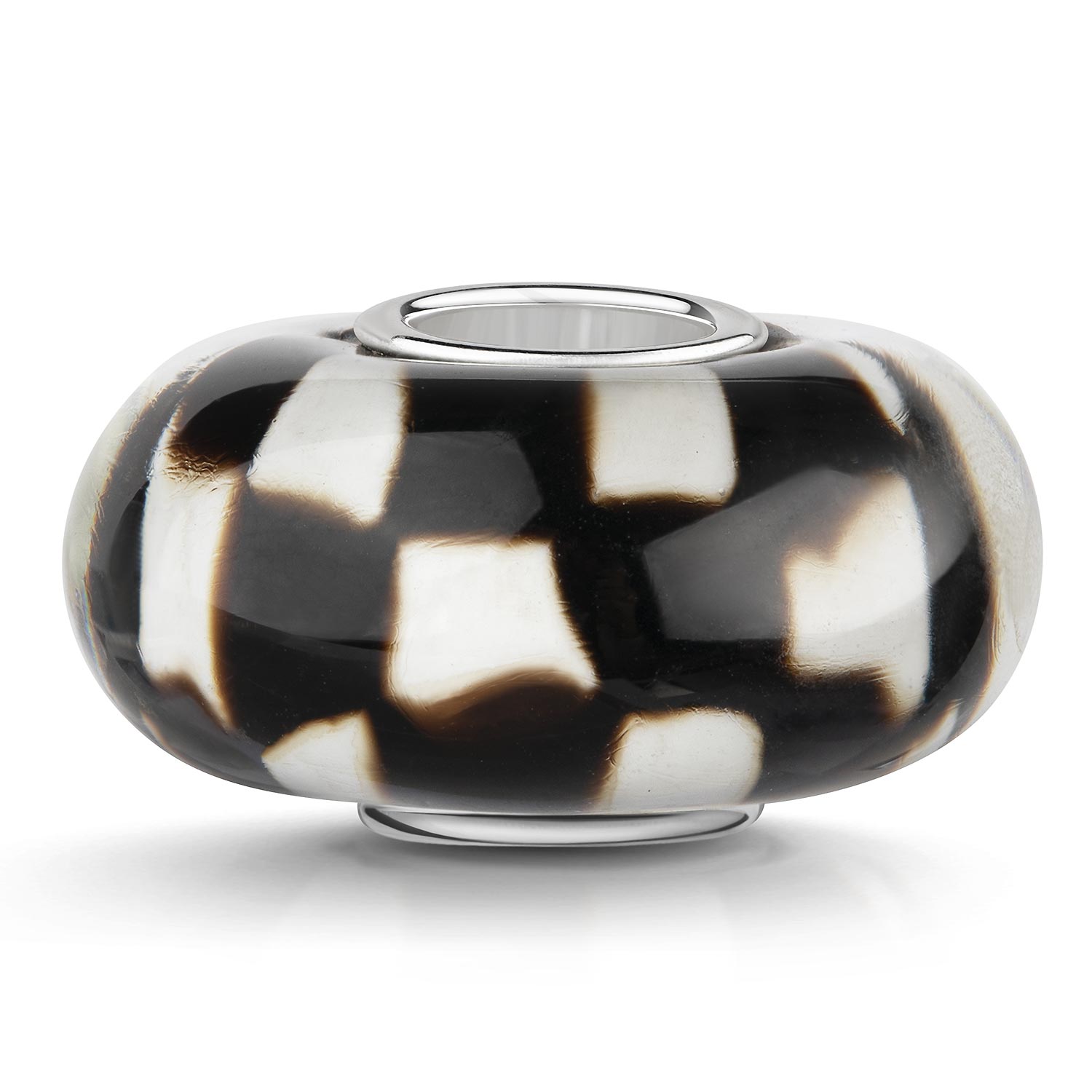 Karierter Glas Bead in Schwarz und Weiß mit Schachbrett-Muster. Der Bead verfügt über eine Hülse aus 925 Silber und passt auf Armbänder aller gängigen Bead Markenarmbänder und Ketten bis 4,4mm Stärke.
