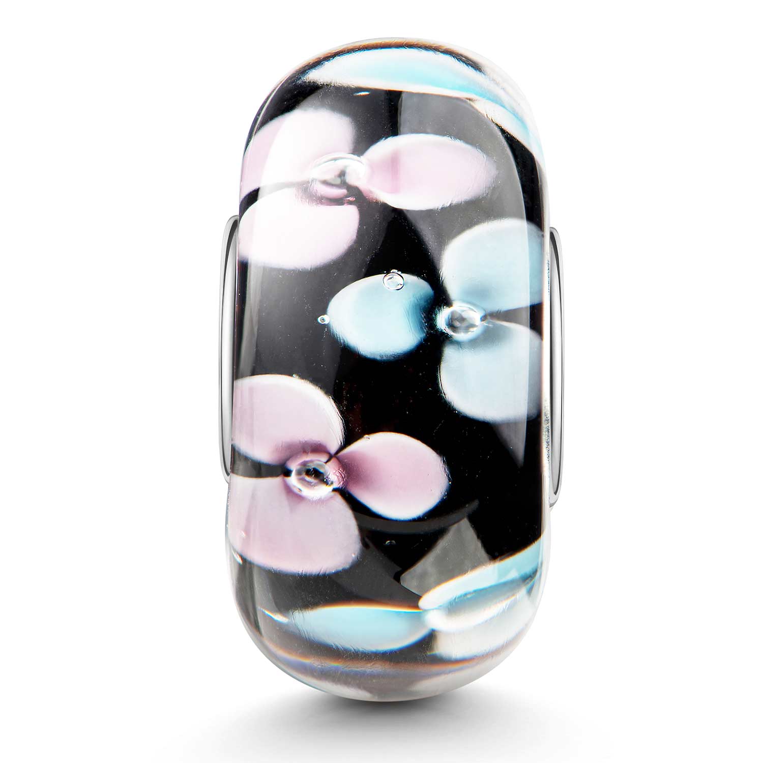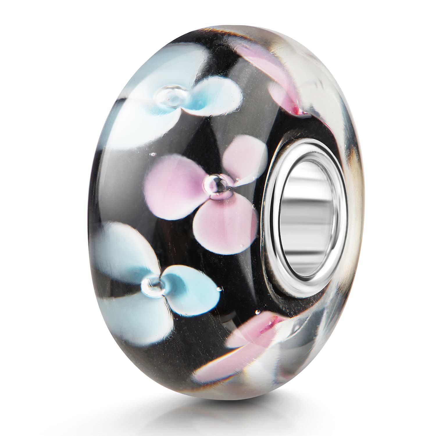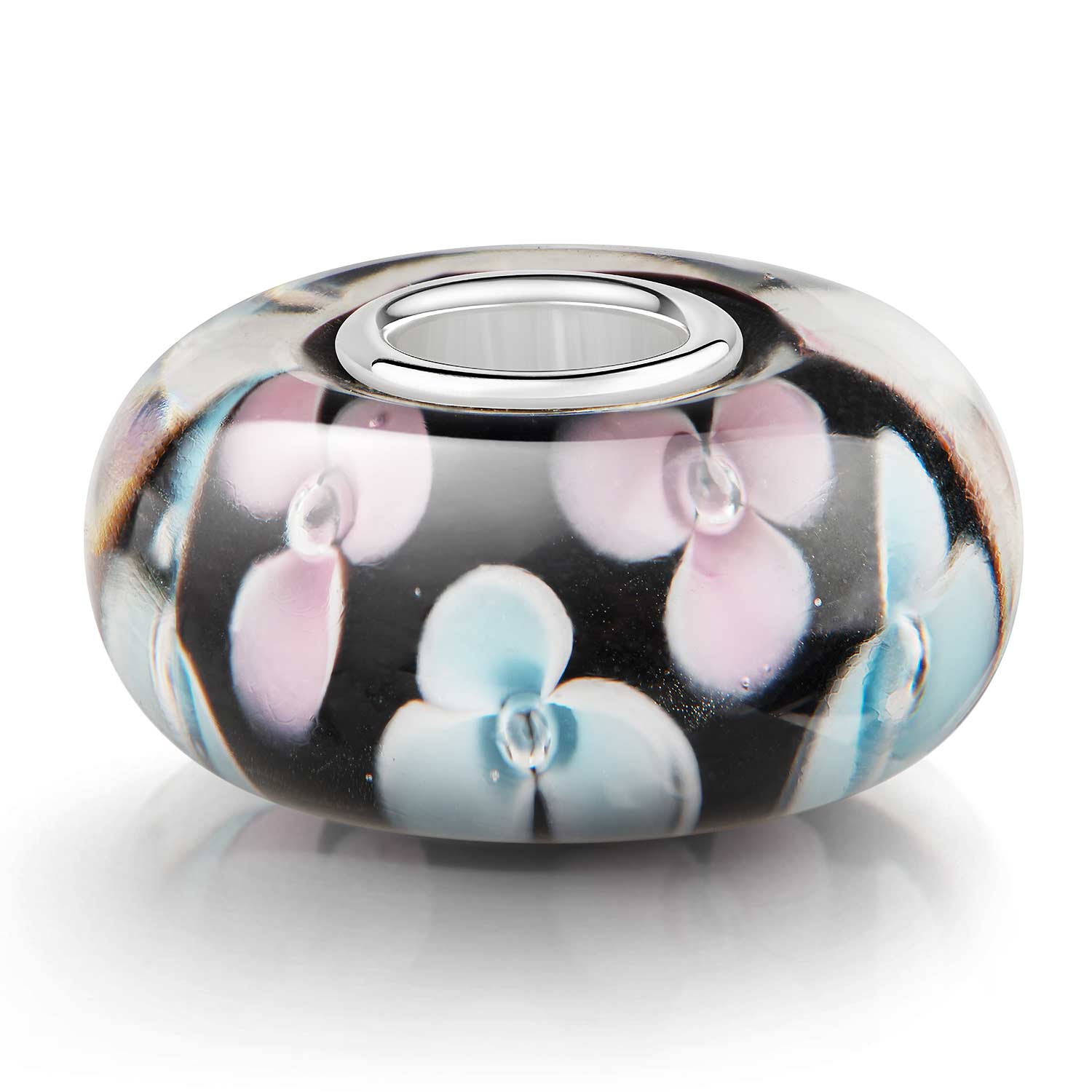Glas Bead "Stiefmütterchen" mit einer Hülse aus massivem 925 Silber in Blumendesign. Auf dem schwarzen Hintergrund sehen die Blüten in Blau und Rosa besonders ansprechend und kontrastreich aus. Dieser Bead ist kompatibel mit allen gängigen Beads Armbändern und Ketten bis max. 4,4mm Breite/ Durchmesser und ist daher für alle Marken Beads geeignet.