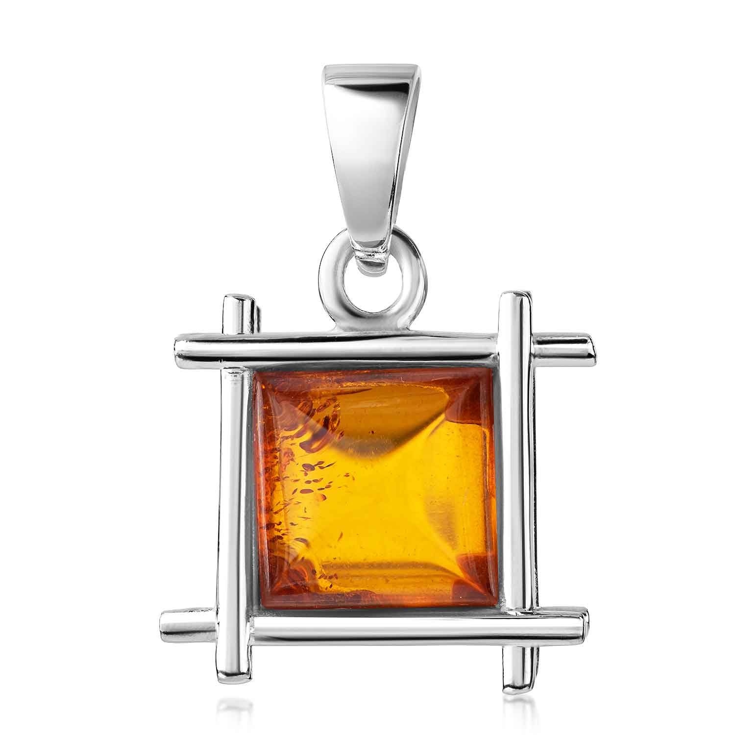 Edler Bernstein Anhänger in quadratischer Form, auf Wunsch als Schmuckset, inklusive Silberkette. Das orange-braune Kleinod ist mit einem echten baltischen Bernstein besetzt.