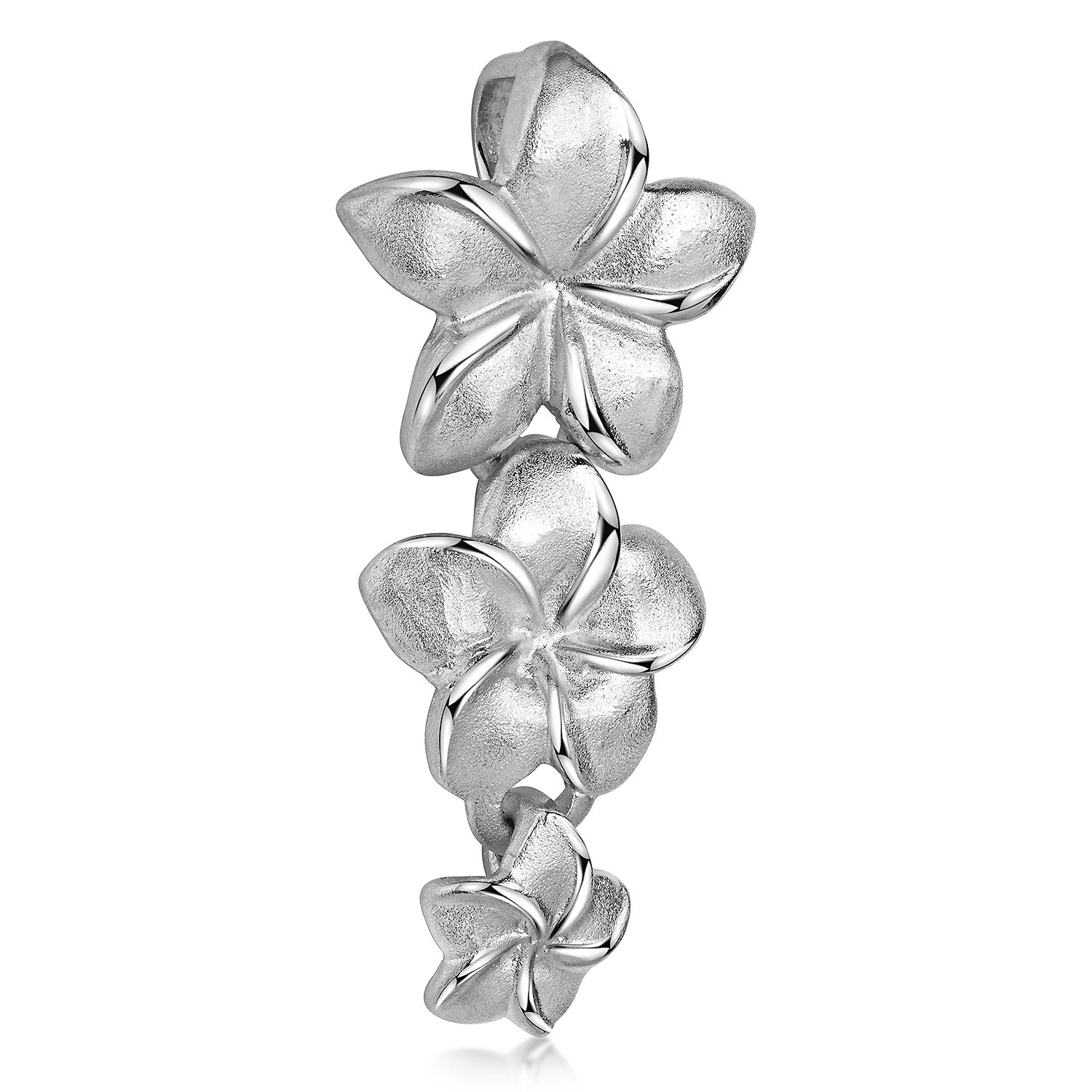Dieser Schmuck Anhänger mit dreifachem Blüten Design wurde aus eismattiertem 925 Sterling Silber gearbeitet. Die Blütenränder stechen durch die diamantierte Oberfläche hervor und formen einen interessanten Kontrast zur mattierten Blütenmitte. Der Kettenanhänger wurde rhodiniert, wodurch er gegen ein Anlaufen des Silbers geschützt ist. Dieses Schmuckstück wird Sie durch das raffinierte Design und die exzellente Verarbeitung begeistern. Der Silberanhänger ist passend für Ketten bis zu einem max. Durchmesser von 3mm.