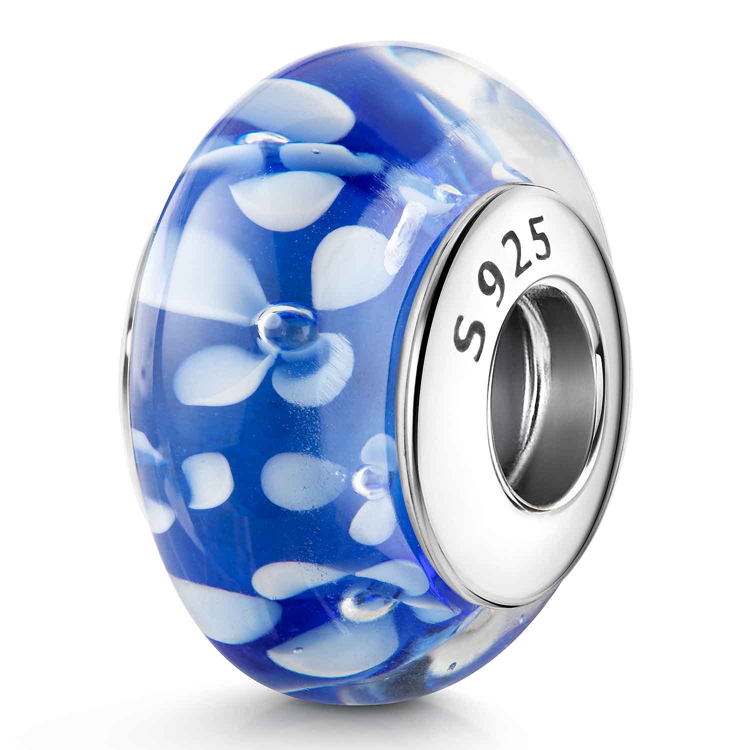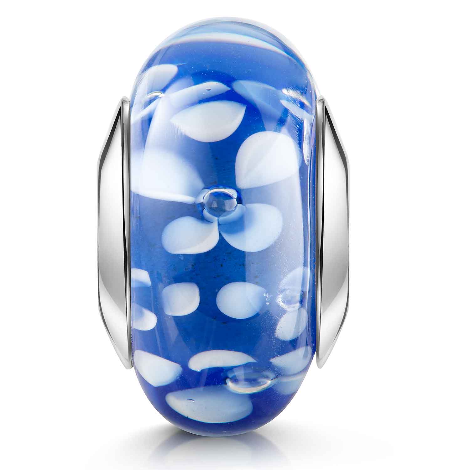 Wunderschöner blauer Glas Bead mit weißen Blumen. Das Besondere an dieser Glasperle ist die breite und massive 925 Sterling-Silber Hülse, welche mit einem Gewinde ausgestattet ist.