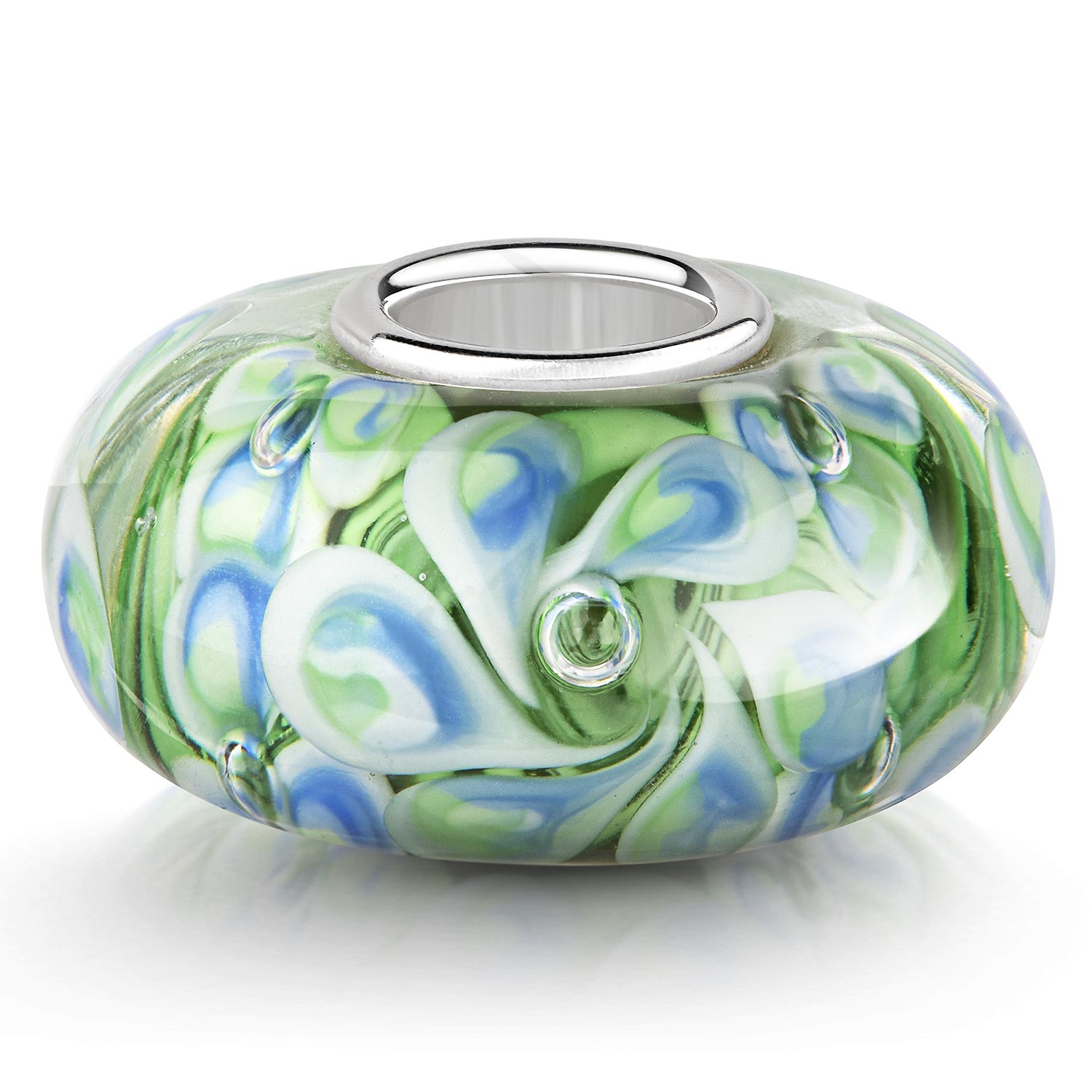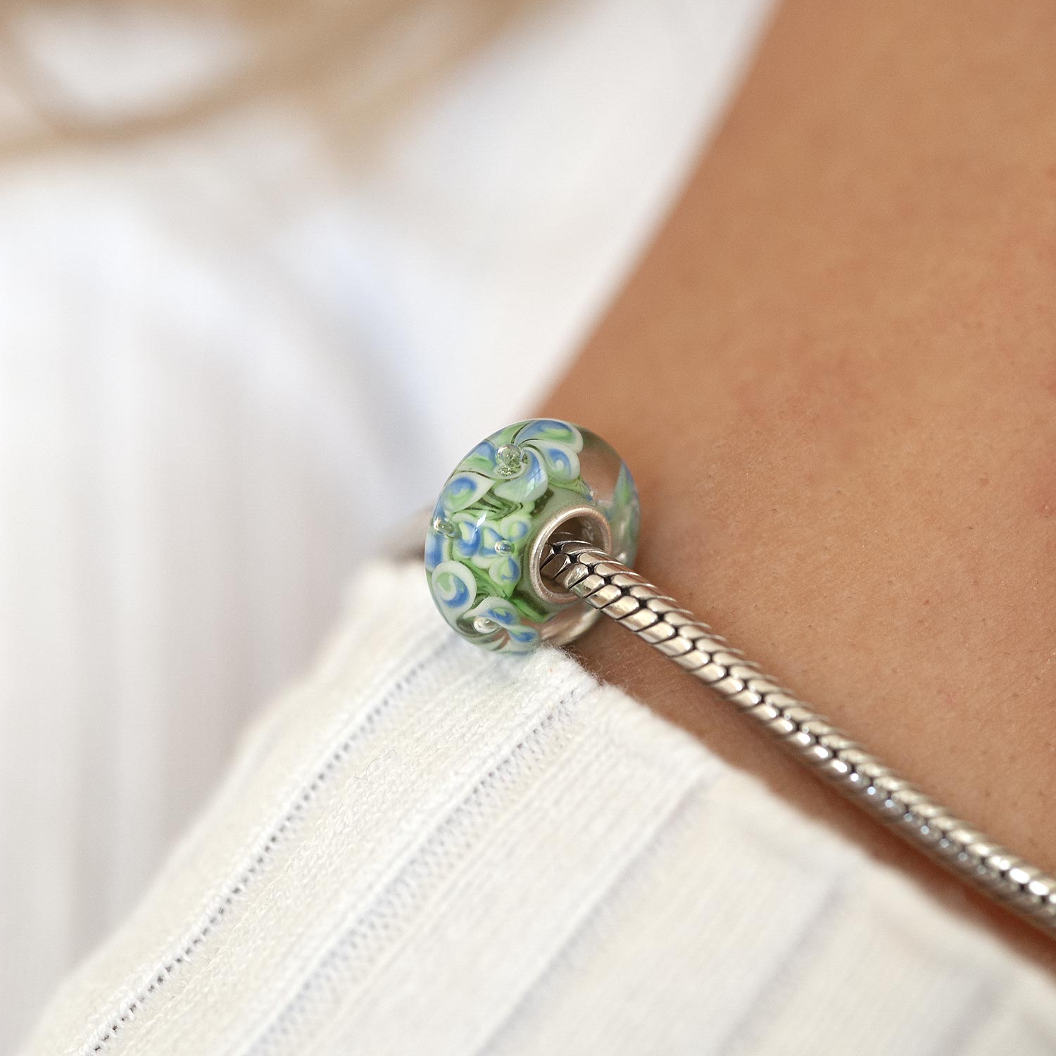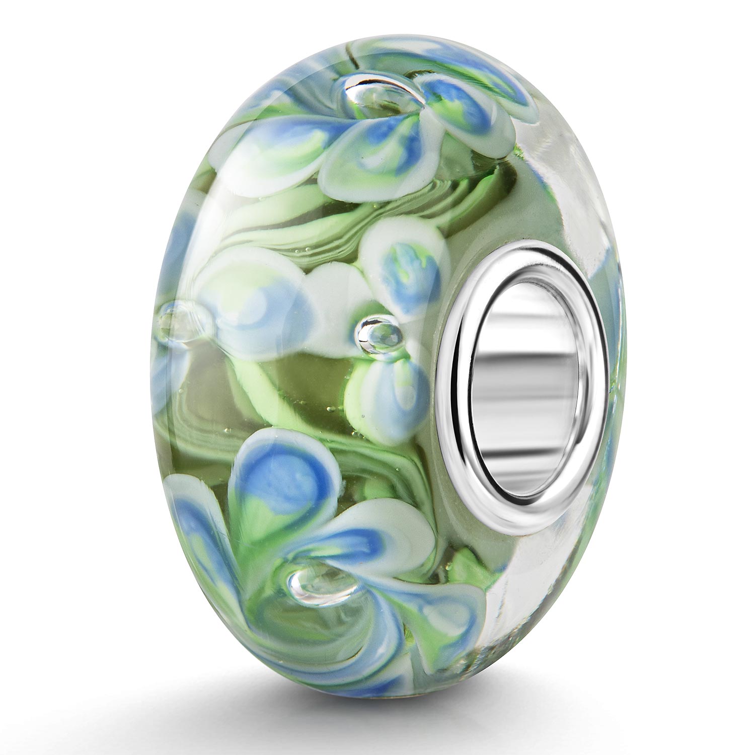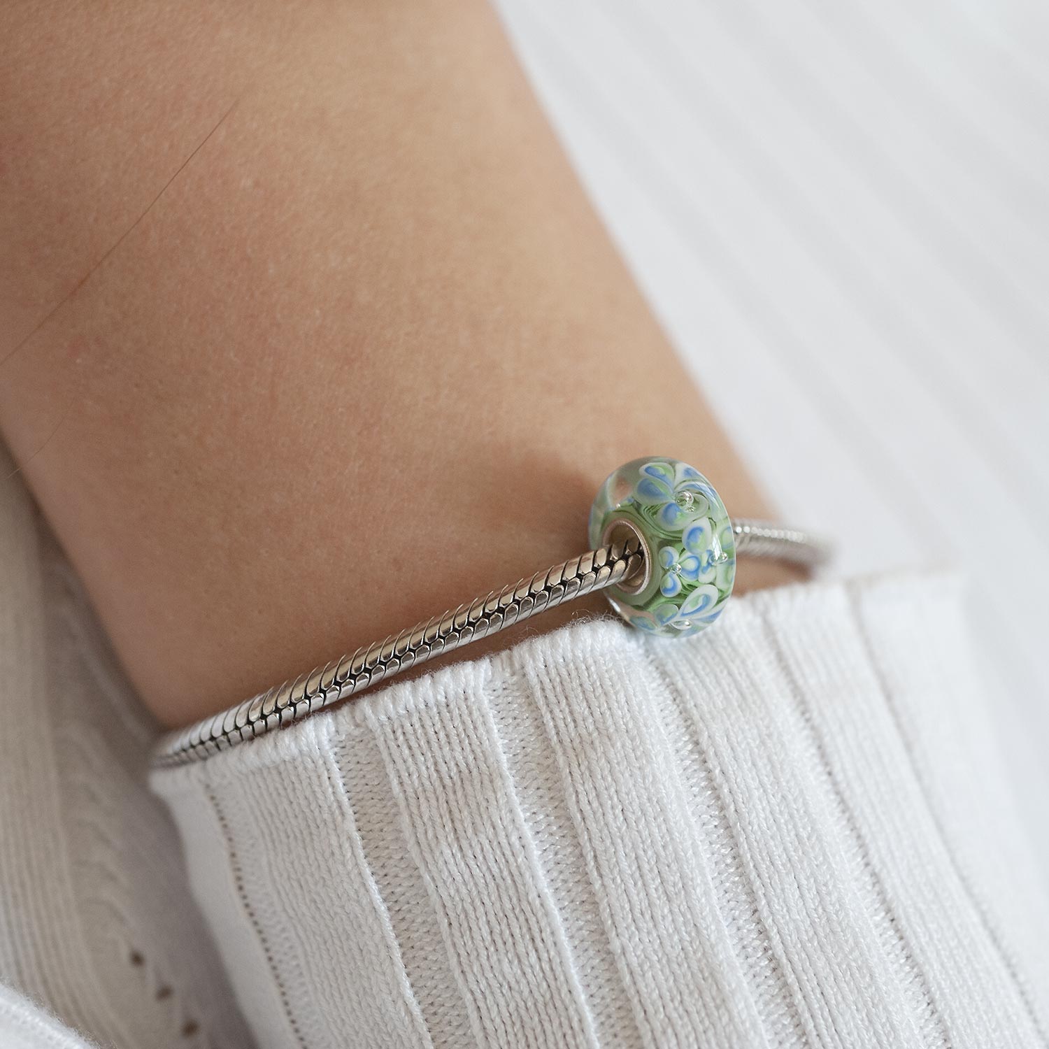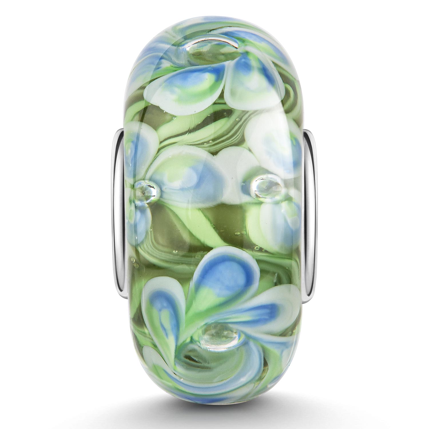 Frischer Glas Bead mit Blüten in Grün, Weiß und Blau und einer Hülse aus 925 Sterling Silber, geeignet für Beads Armbänder und Ketten bis max. 4,4mm.