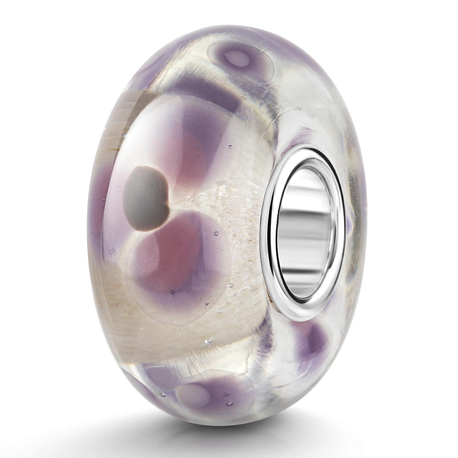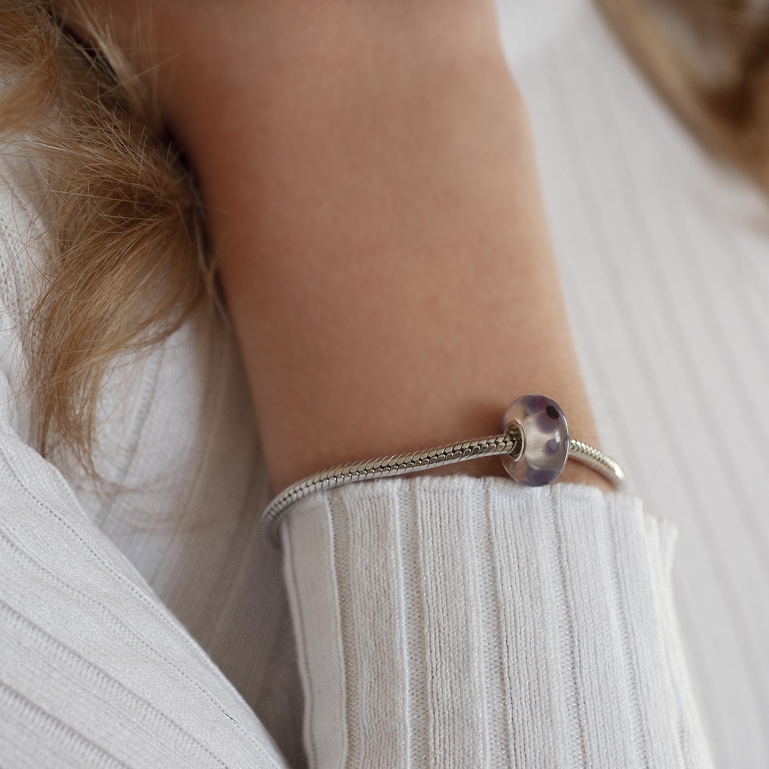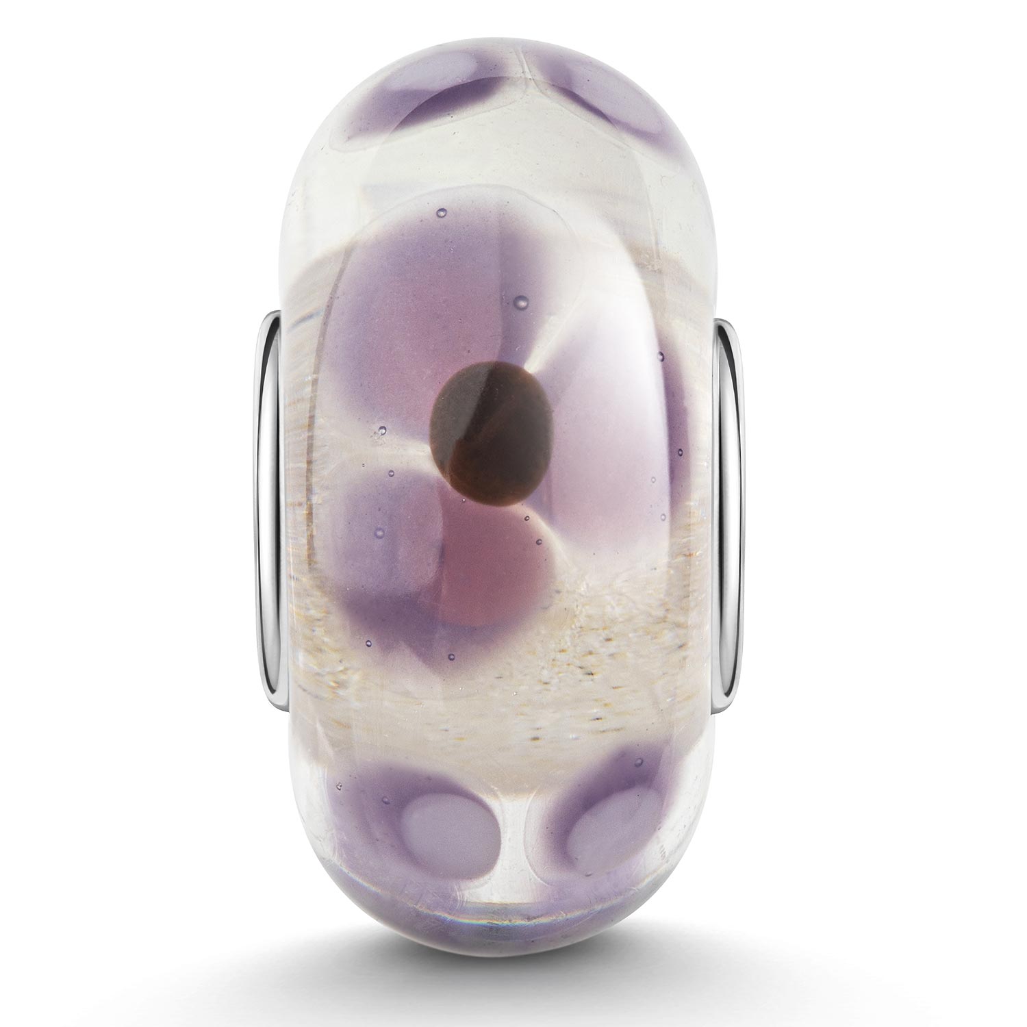 Unser weißer Glas Bead wird Sie durch seine lila Blumen im Glasinneren begeistern. Der Bead ist mit einer Hülse aus massivem 925 Sterling Silber ausgestattet. Er ist passend zu allen gängigen Beads Armbändern und Ketten bis max. 4,4mm Breite und ist daher auch besonders für alle gängigen großen Beads Marken geeignet.