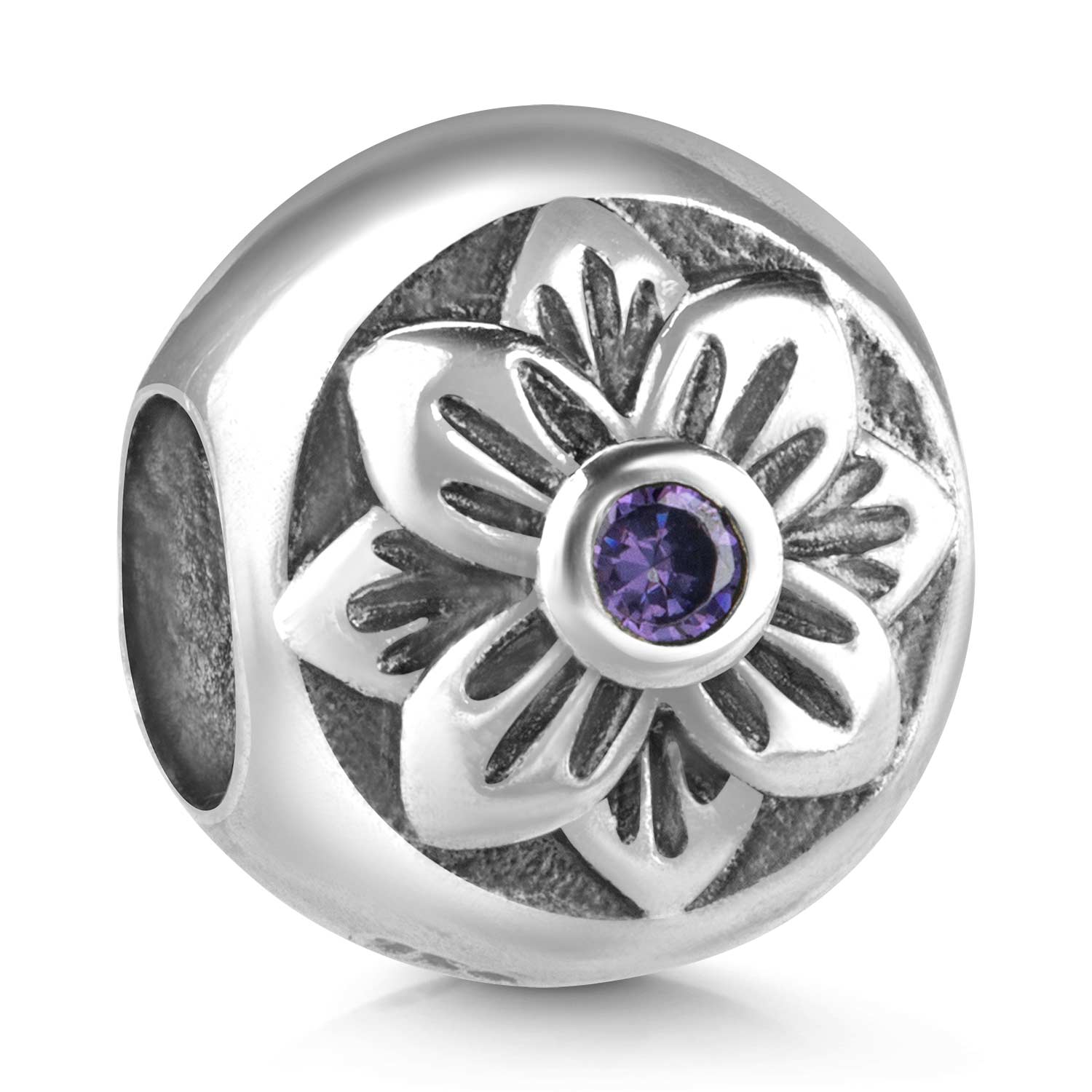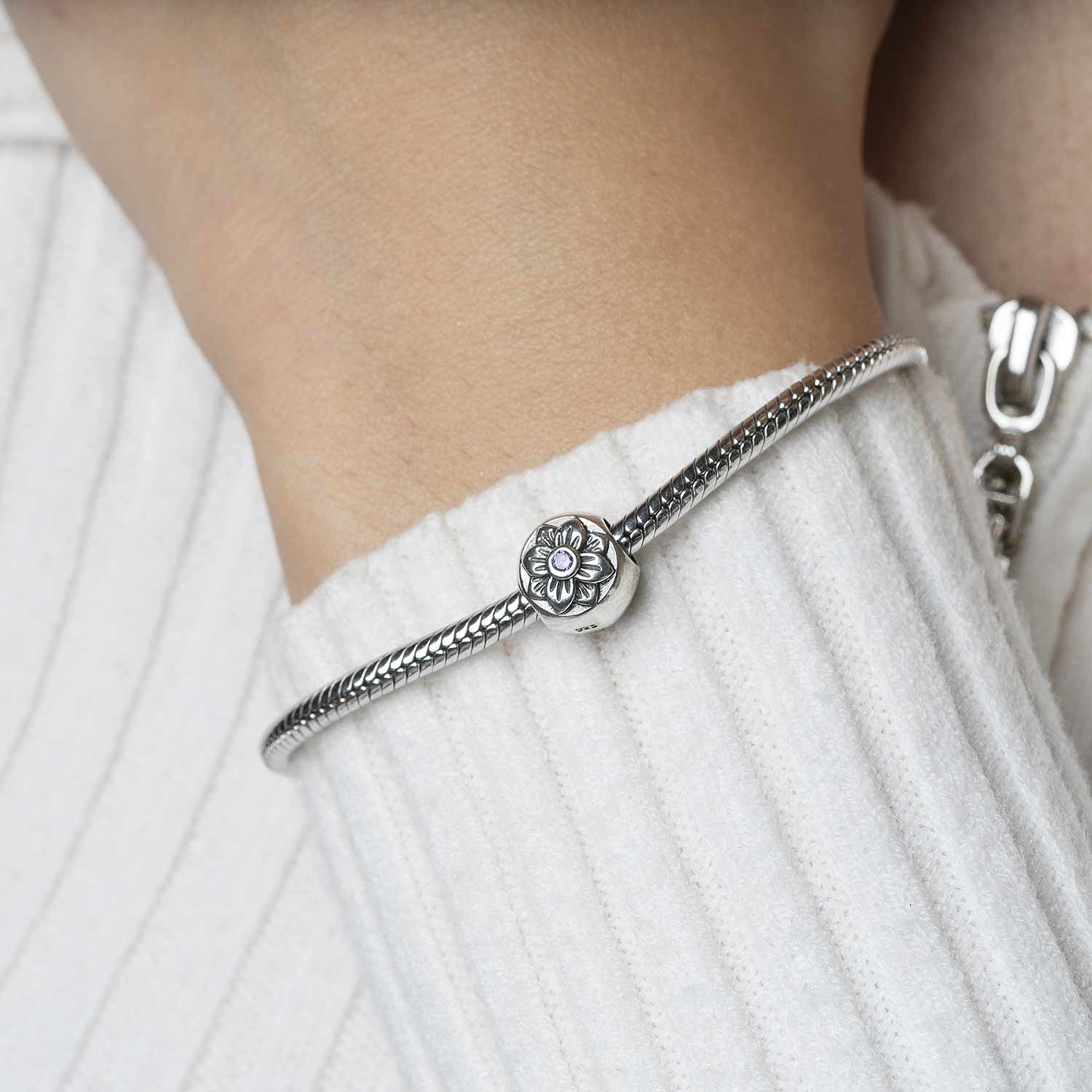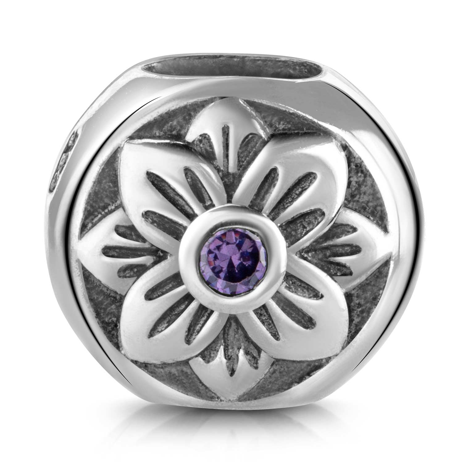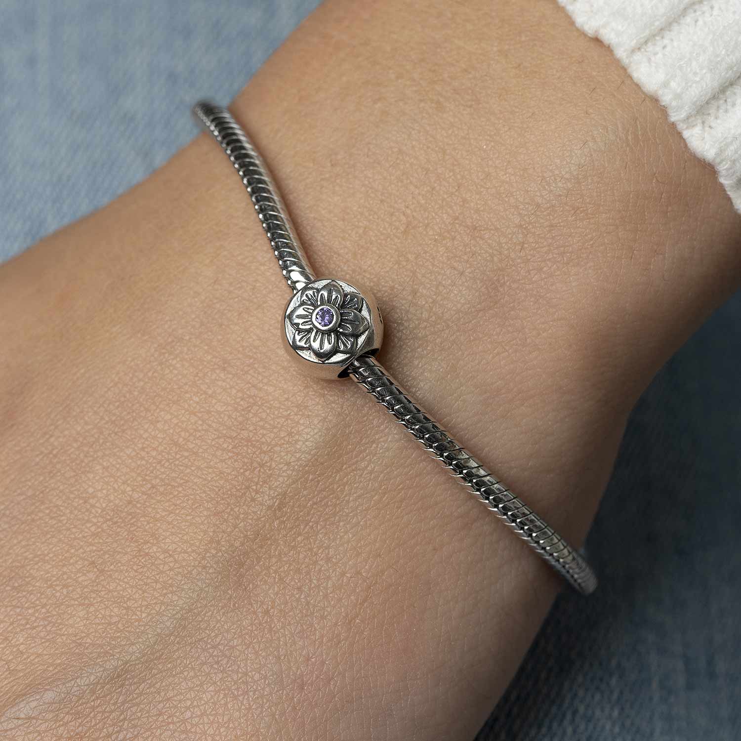 Runder Bead aus massivem 925 Sterling Silber mit Blume-Motiv. Die Mitte der Blüte ziert ein lila Zirkonia Stein. Außerdem wurde der Charm Anhänger antik geschwärzt, was die Konturen und Details hervorhebt. Der Bead passt auf alle handelsüblichen European Armbänder und Ketten bis zu einer max. Stärke von 4,4mm.