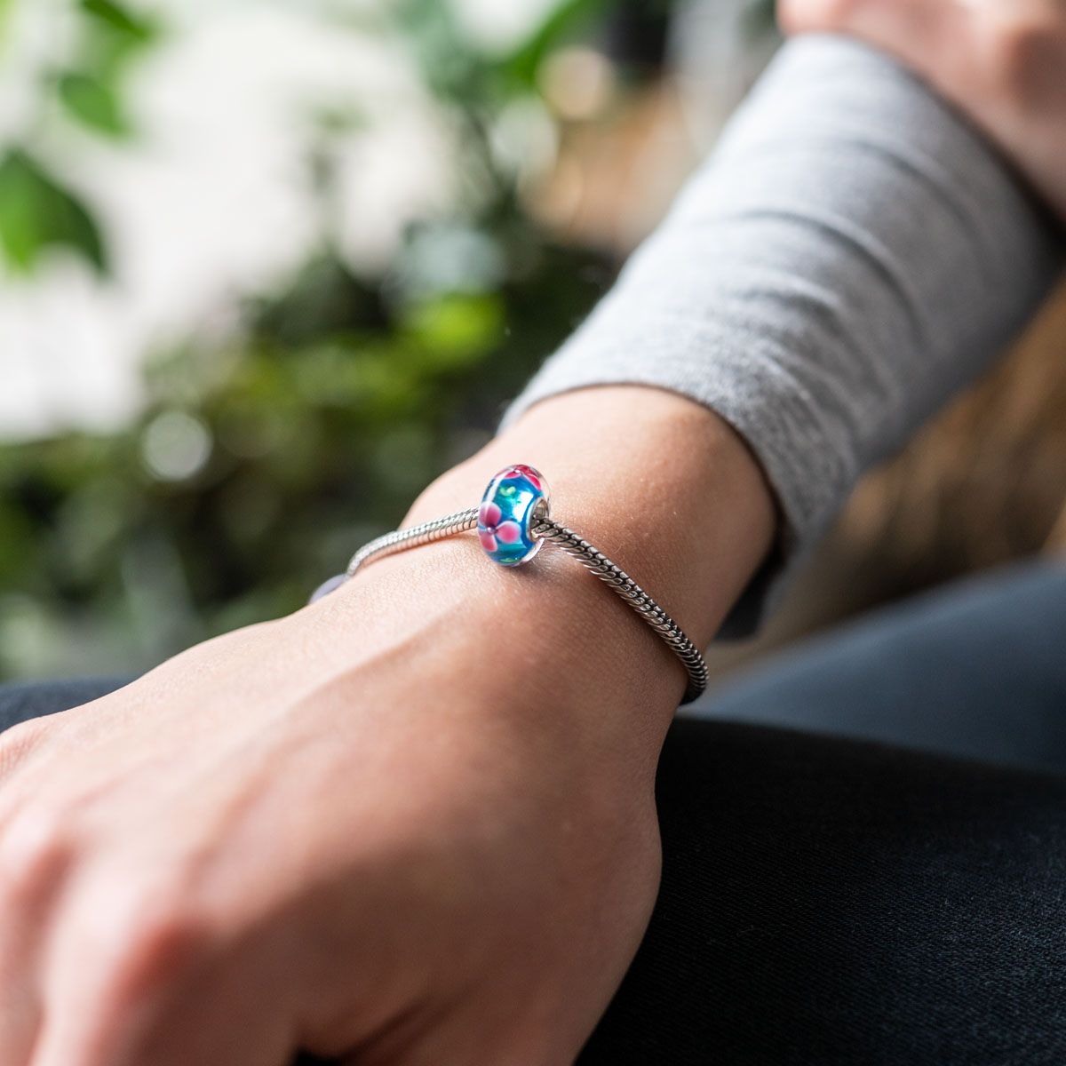 Dieser blauer Glas Bead mit pinken Blütenmotiven hat eine eingearbeitete Glitzerfolie im Glasinneren. Er ist zusätzlich mit einer Hülse aus massivem 925 Sterling Silber ausgestattet. Dieser Silber Bead ist passend zu allen gängigen Beads Armbändern und Ketten bis max. 4,4mm Breite/ Durchmesser und ist daher auch besonders für alle gängigen großen Beads Marken geeignet.