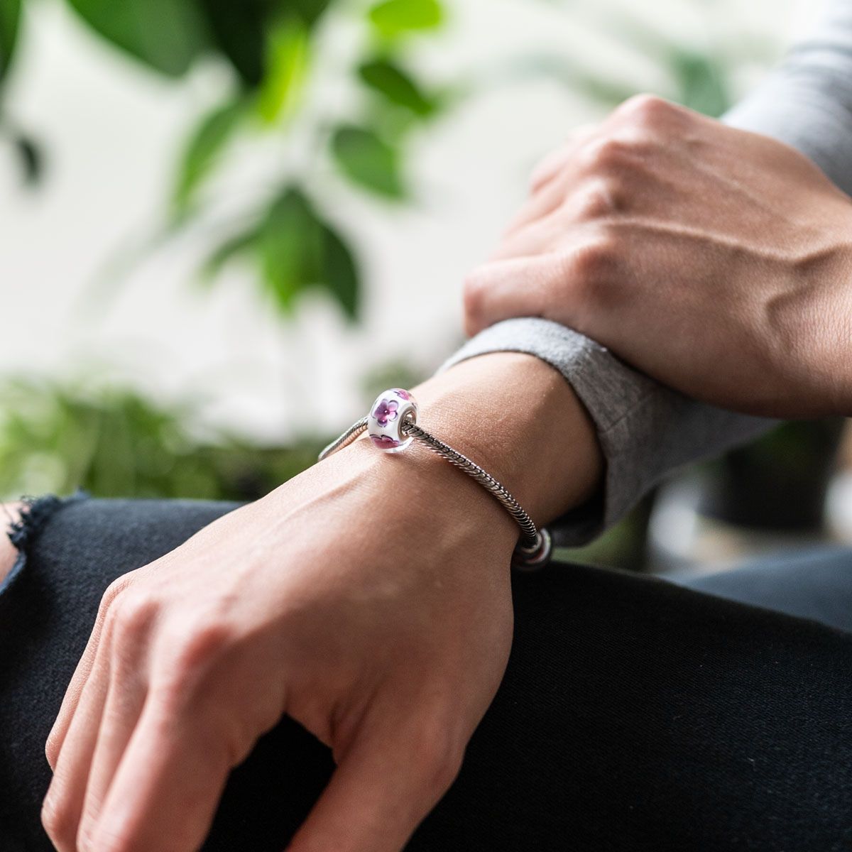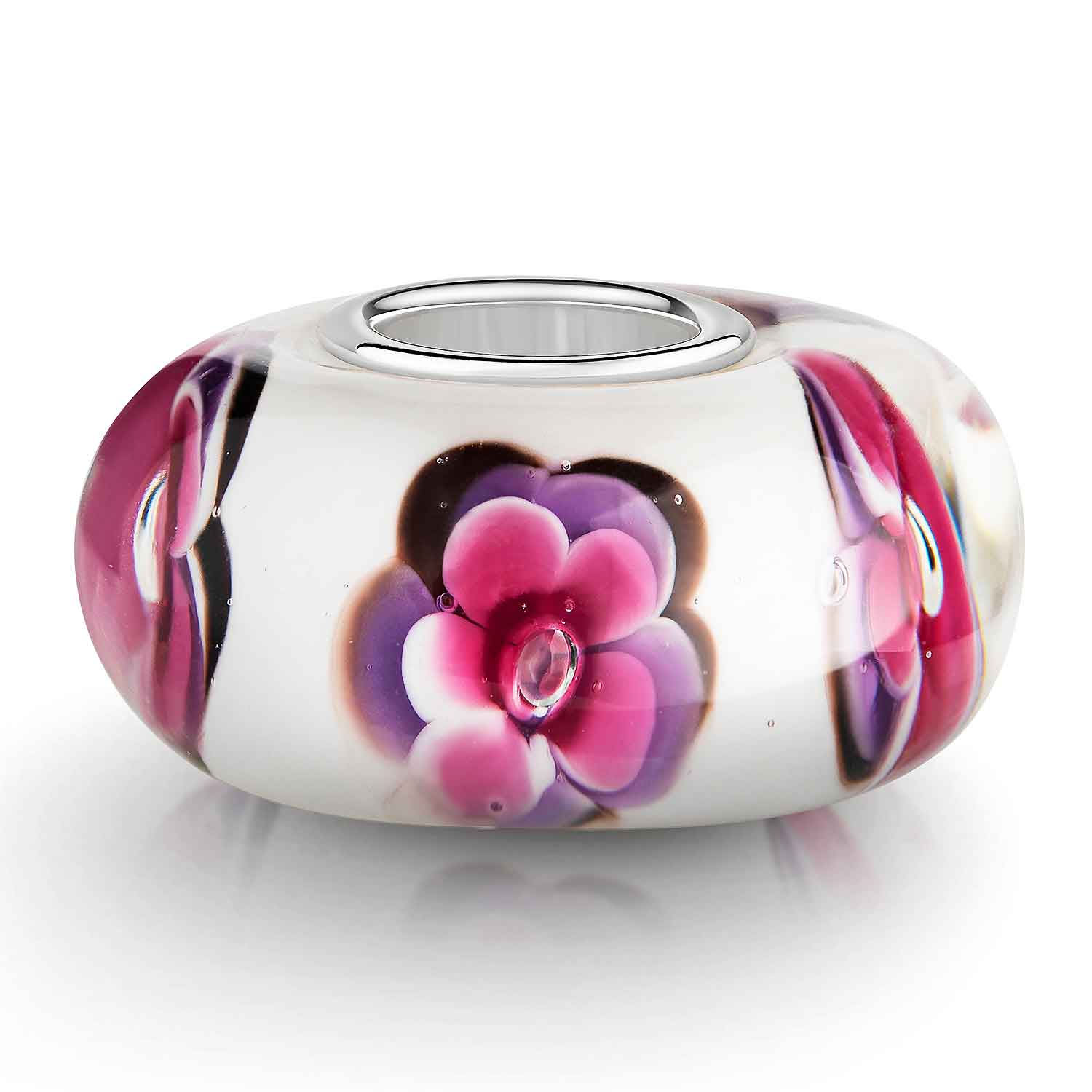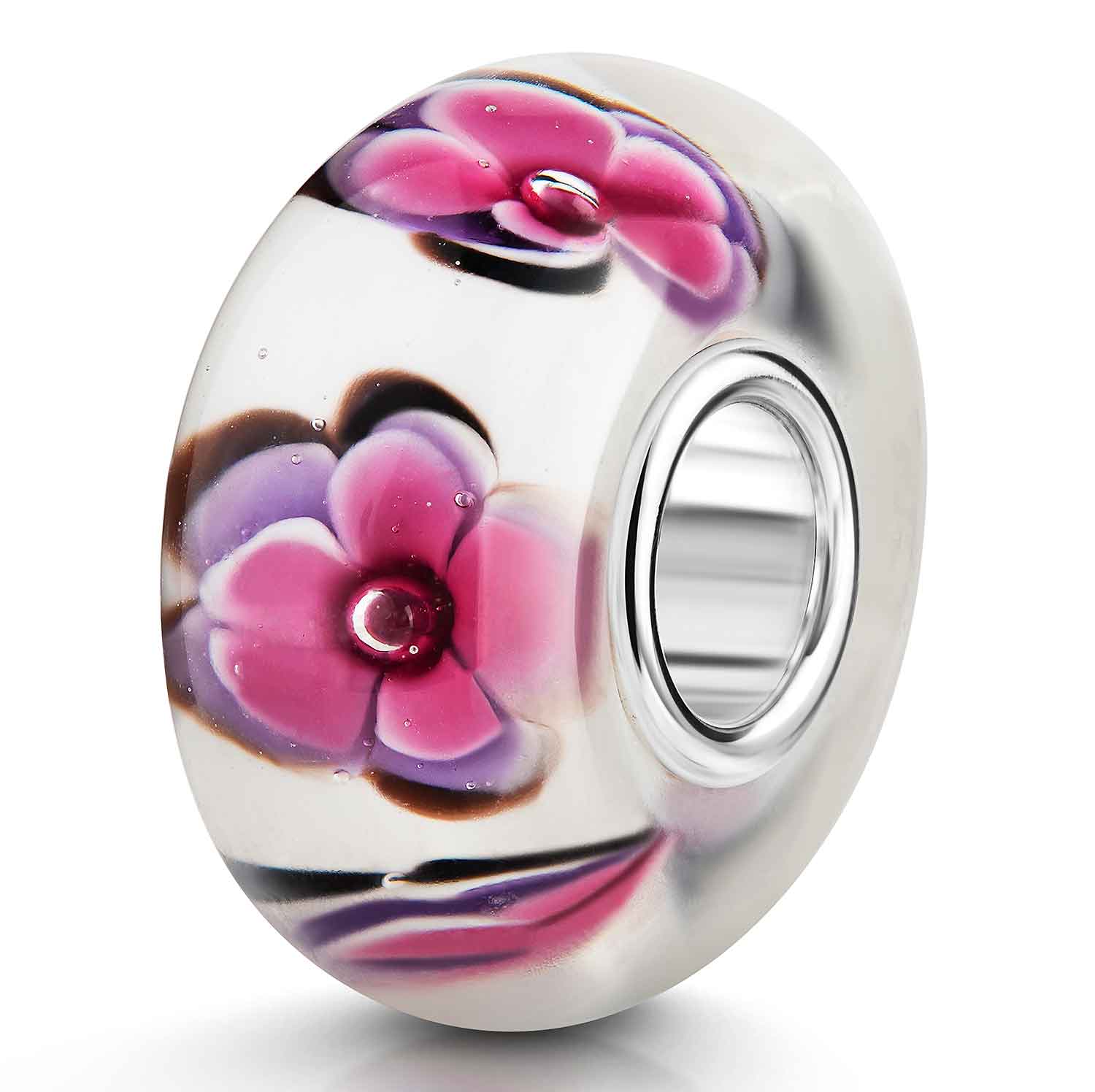 Dieser 925 Silber Bead aus Glas in den Farbtönen Weiß, Lila und Pink ist mit zahlreichen Blumenmotiven und kleinen Luftblasen verziert. Er ist passend zu allen gängigen Beads Armbändern und Ketten bis max. 4,4mm Breite und ist daher für alle Marken Beads geeignet. Mit diesem und anderen vielfältigen Beads aus unserer Kollektion können Sie Farbakzente in Ihrer Kleidung setzen und so Ihren Look am Handgelenk oder einer Halskette individuell gestalten.