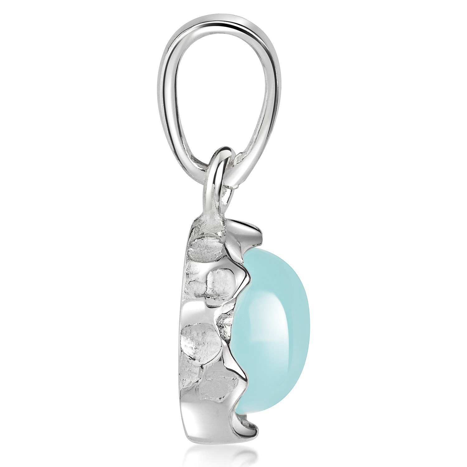 Runder Anhänger mit hellblau schimmerndem Chalcedon Edelstein in außergewöhnlicher gewölbter Optik.