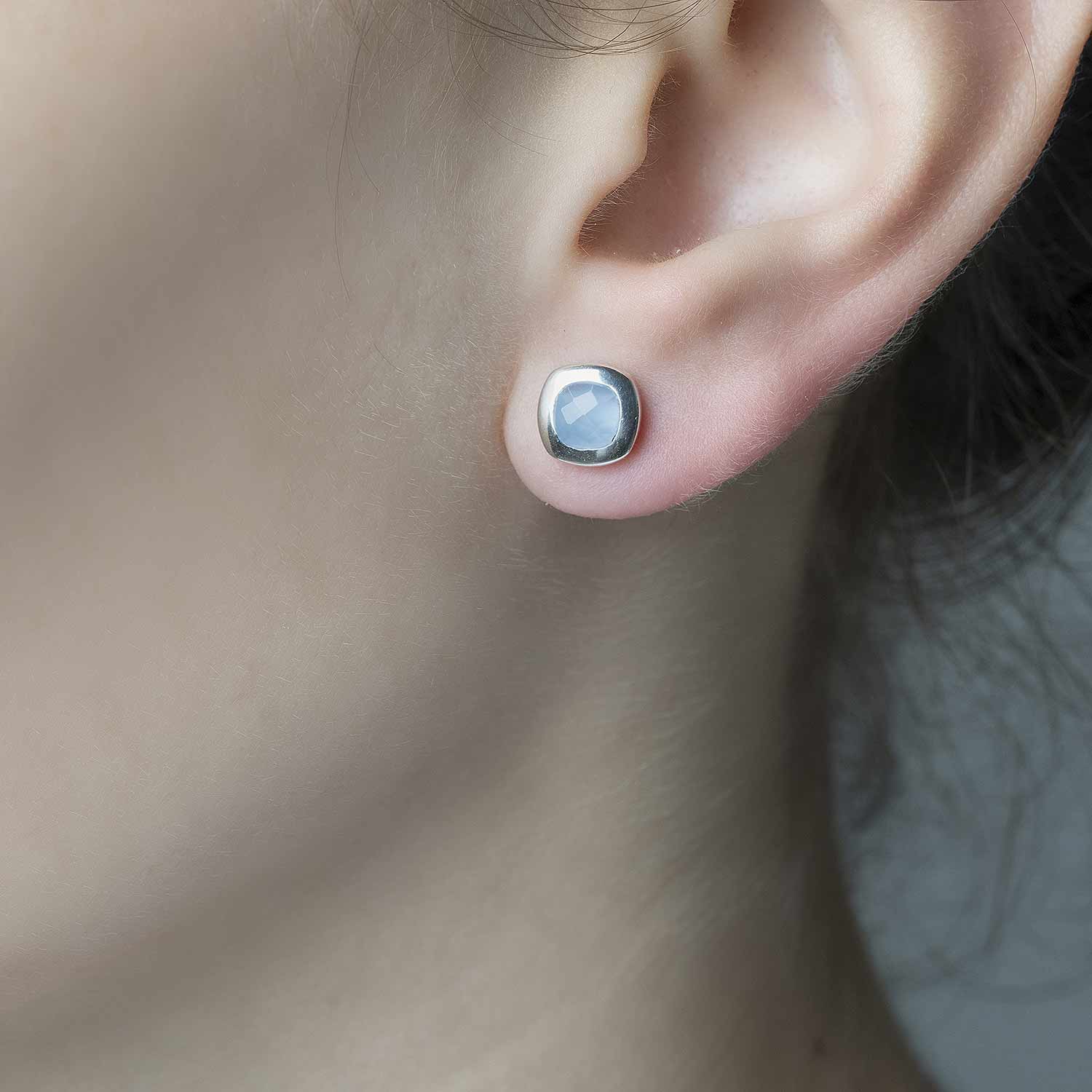 Quadratische Damen Ohrstecker mit echten Chalcedon Edelsteinen aus rhodiniertem 925 Sterling Silber.