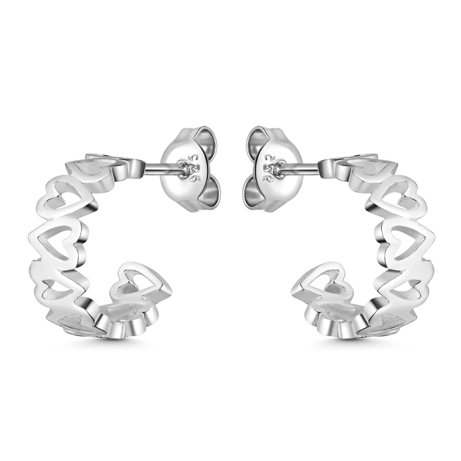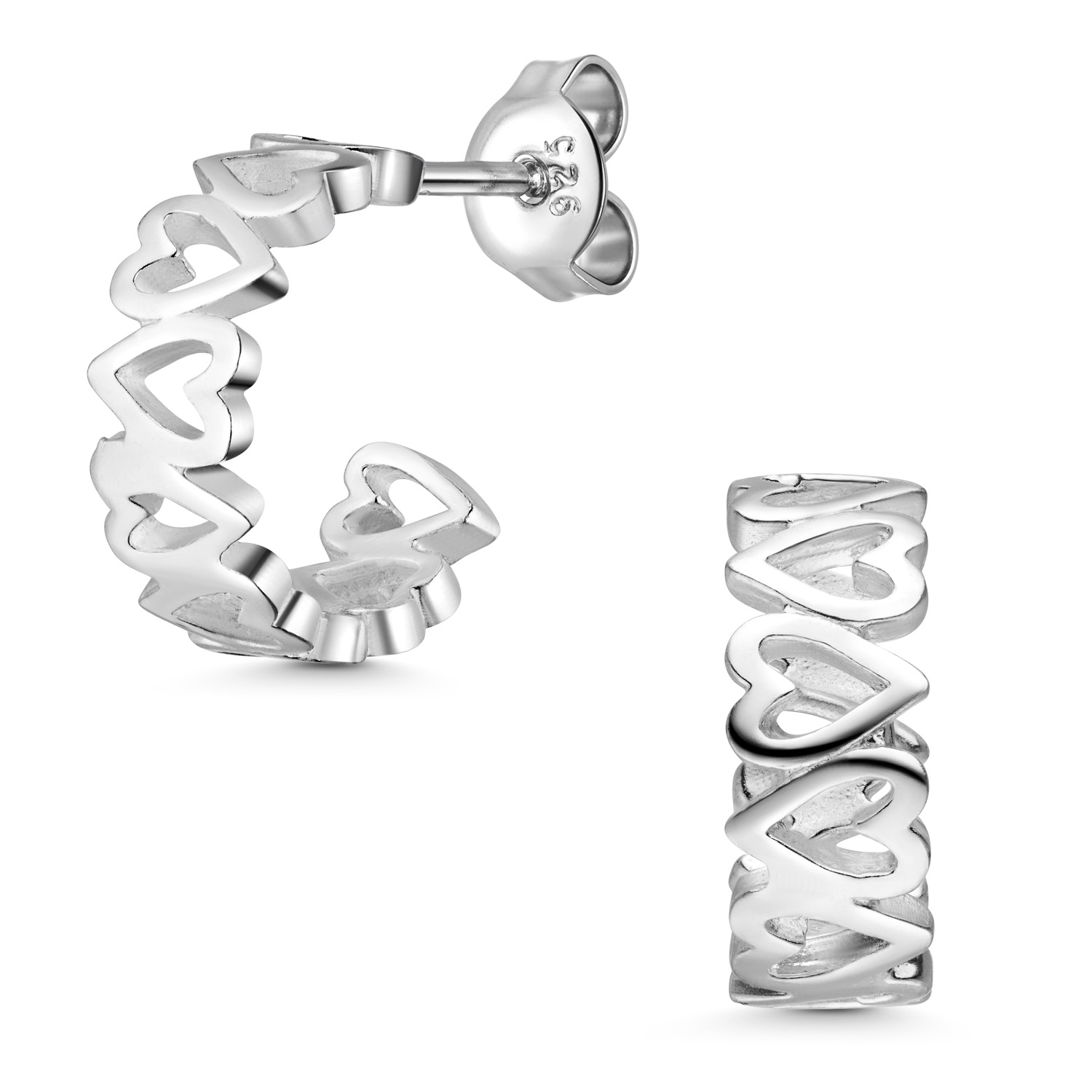 Trendige Damen Creolen mit Herzen aus 925 Sterling Silber. Klassische Butterfly-Verschlüsse sorgen für sicheren Halt.