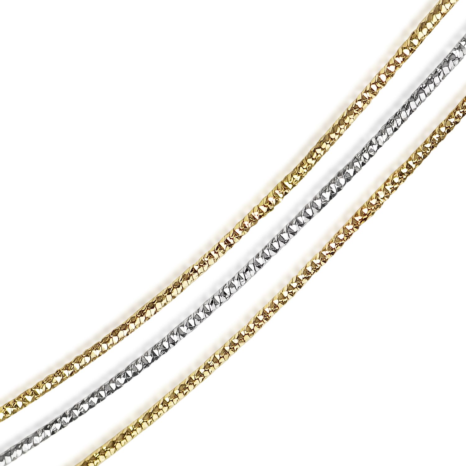 Diese 3-reihige Armkette in bicolorer Optik erzeugt durch die besondere Verarbeitung ein zartes Glitzern und bietet durch ihr geringes Gewicht einen hohen Tragekomfort. Sie stammt aus deutscher Silberschmiede und wurde aus 925 Sterling Silber gearbeitet. Das Armband wurde mit Rhodium überzogen und partiell vergoldet. Dank des Verlängerungskettchens auch als Geschenk bestens geeignet, da es passend für die meisten Handgelenke ist.