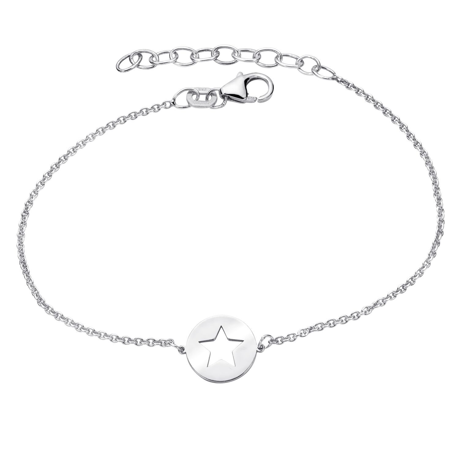 Zauberhaftes Armband, verziert mit einem fünfzackigen Stern. Das Schmuckstück aus 925 Sterling Silber wurde hochwertig rhodiniert. Mithilfe eines Verlängerungskettchens kann es stufenlos von 16cm auf bis zu 18,5cm erweitert werden. Verzaubern Sie Ihre Liebste, indem Sie ihr diese wundervolle Armkette zum Geburtstag, Weihnachten oder als kleine Aufmerksamkeit für Zwischendurch schenken.