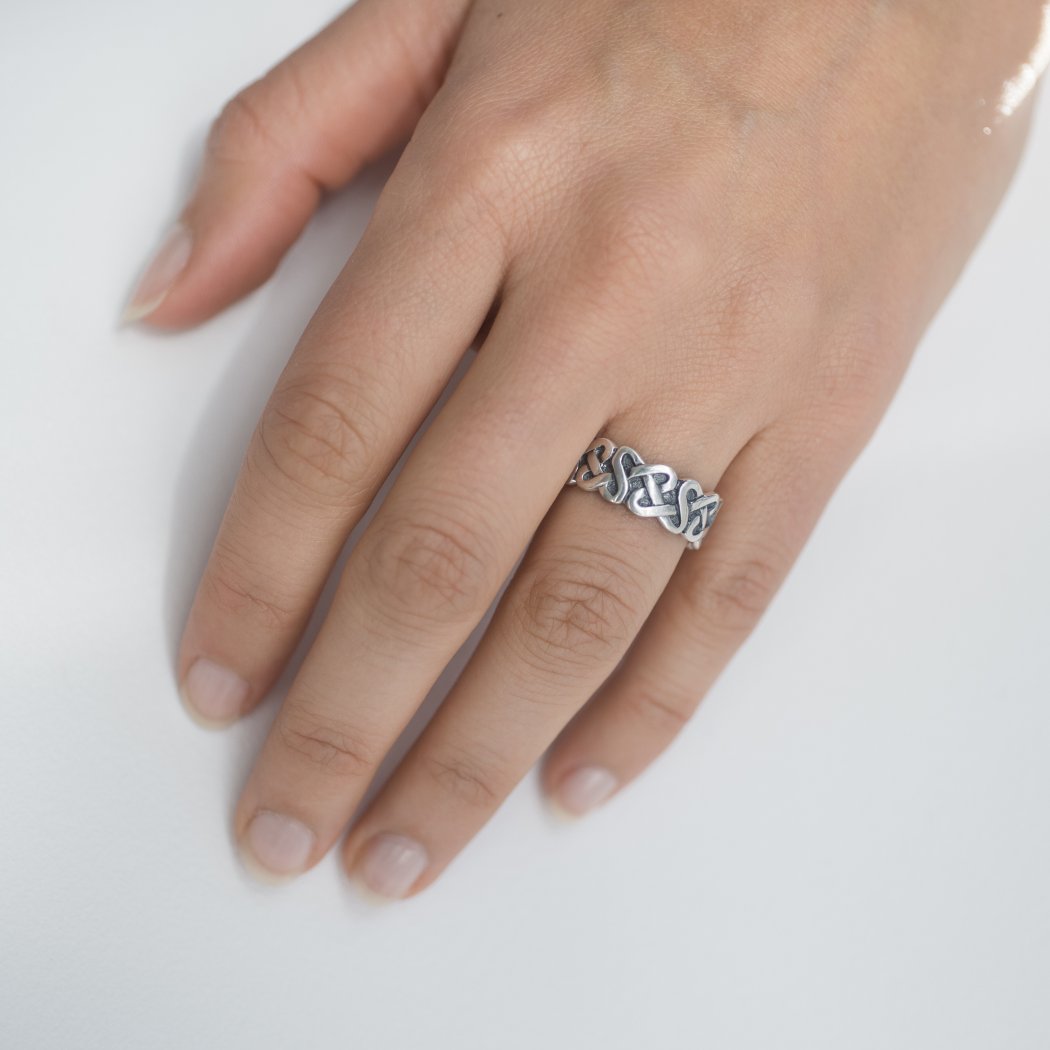 Unser keltischer Bandring hat eine besondere Struktur - die Außenränder der Ringschiene sind gewellt und verlaufen im Einklang mit dem Knoten Design. Der Ring wurde in erfahrener Silberschmiede aus leicht geschwärztem, massivem 925 Silber gearbeitet. An den hochglanzpolierten Partien wurde er rhodiniert und ist somit gegen ein Anlaufen geschützt. Die Auslieferung erfolgt inkl. Schmuckschachtel.