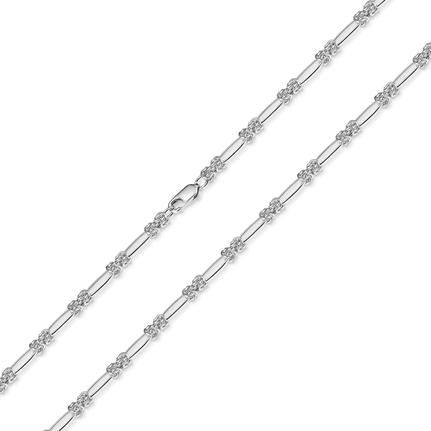 +Unsere Variation von Königskette mit ausgedehnten Zwischengliedern weicht in der Optik vom herkömmlichen Königsketten Design signifikant ab und sieht besonders interessant aus. Das Collier wurde in deutscher Silberschmiede aus rhodiniertem 925 Sterling Silber hergestellt. Es ist mit einem stabilen, praktischen Karabinerverschluss ausgestattet.