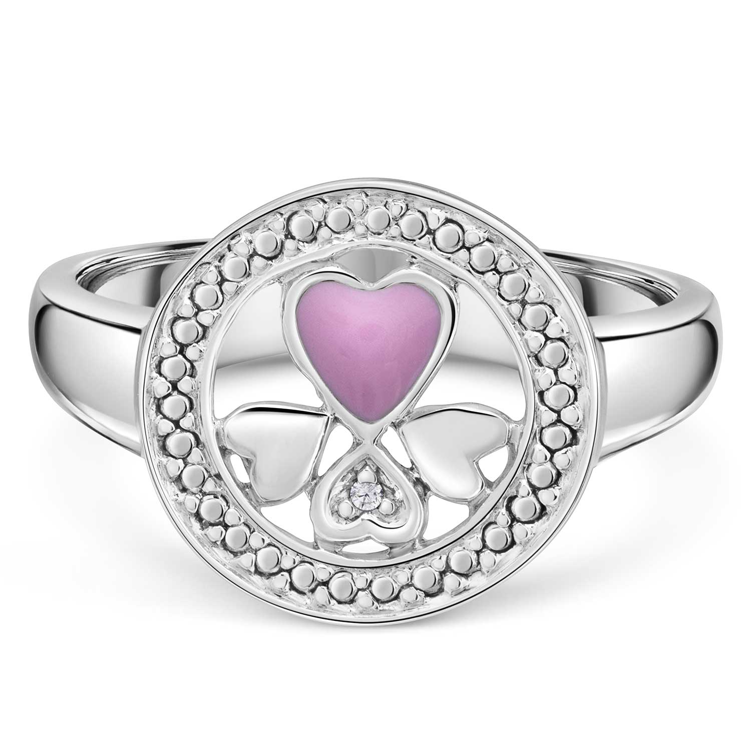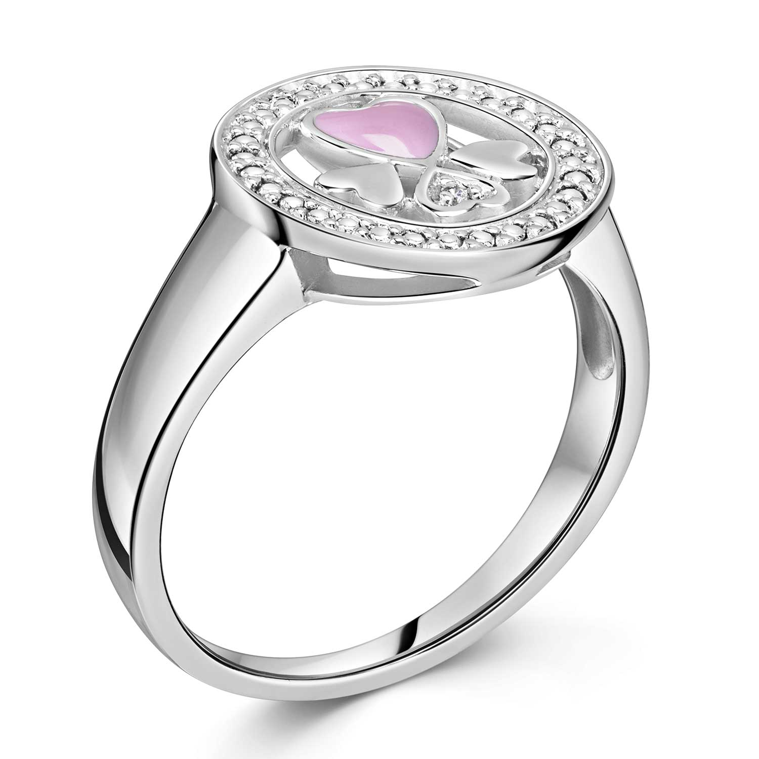 Runder 925 Silber Ring mit Herzdesign, rhodiniert und teilweise pink emailliert.