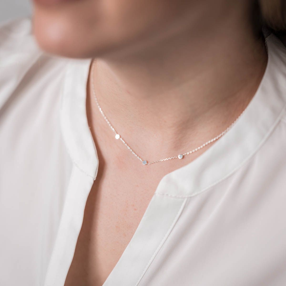 3 kleine, runde Plättchen zieren das schmale Collier im Dekolleté-Bereich. Es stammt aus deutscher Silberschmiede und wurde aus 925 Sterling Silber gearbeitet.