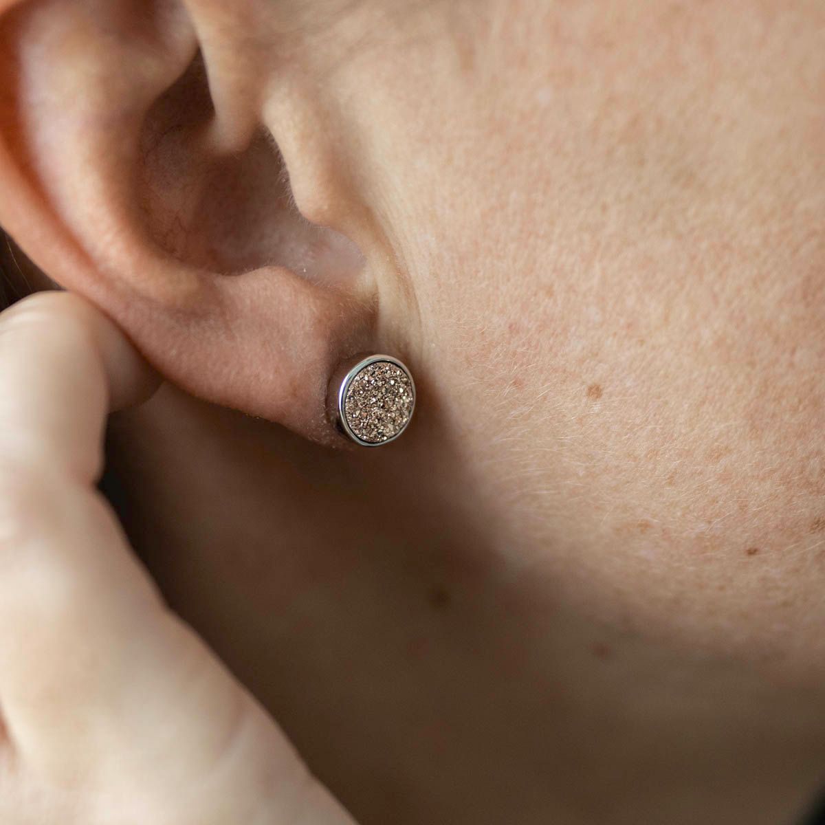 Runde Ohrstecker mit rosefarbenem Druzy Quarz