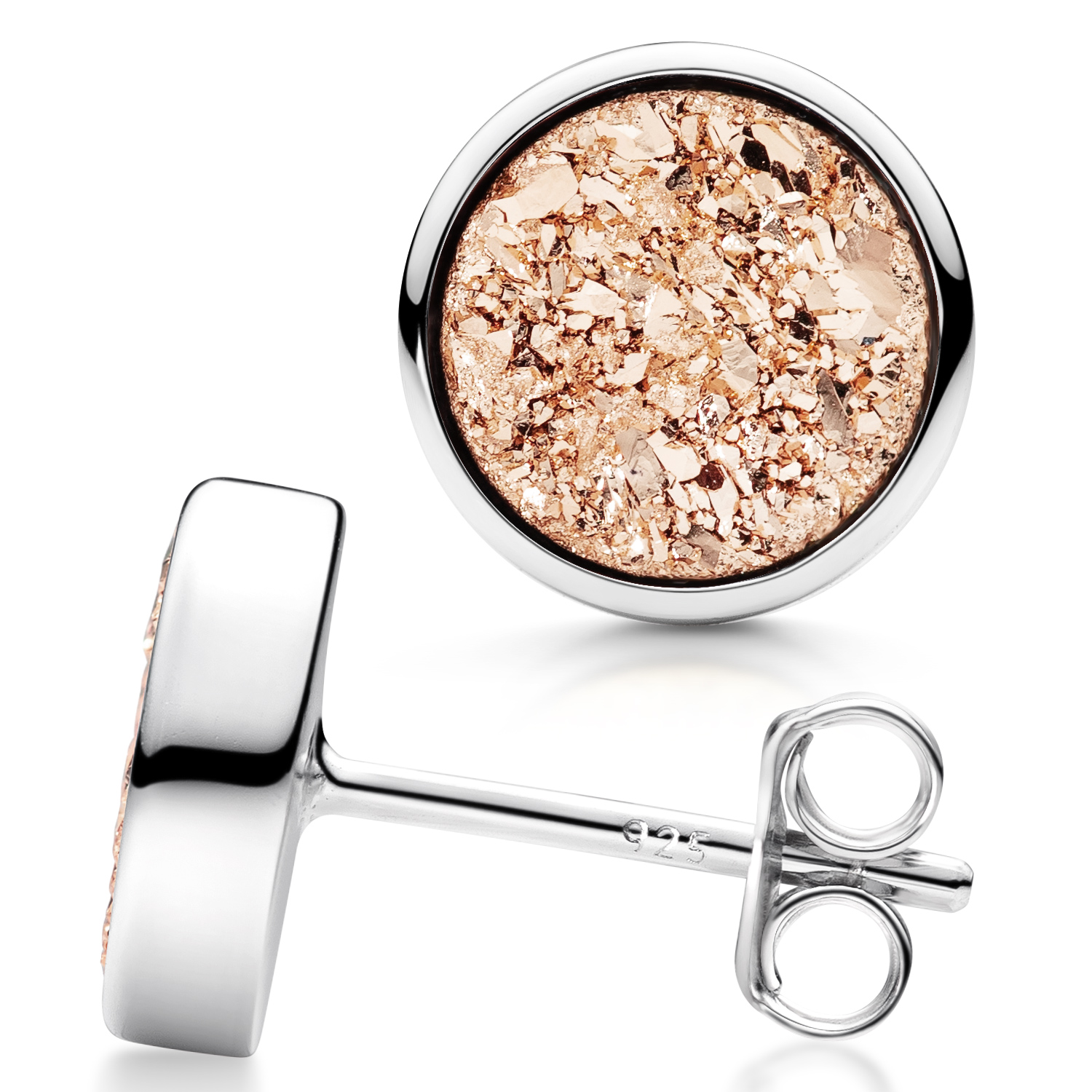 Runde Ohrstecker mit gefärbtem Druzy Quarz Naturstein in Rose aus rhodiniertem 925 Sterling Silber. Weitere Farben erhältlich.