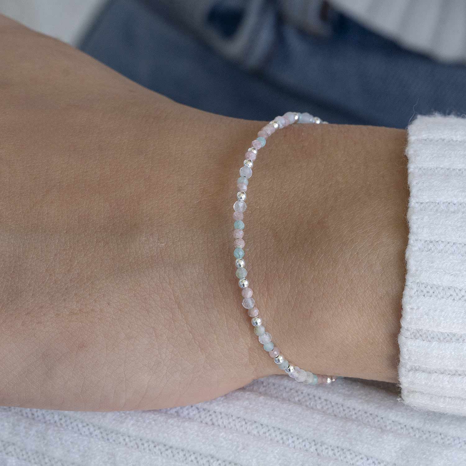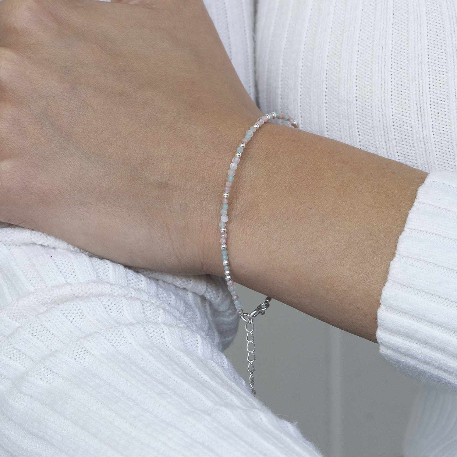 Zartes Armband mit facettierten Mondstein, Amazonit und Rhodonit Steinen und Perlen aus 925 Sterling Silber. Das Edelstein-Armband ist von 17 bis 19,5cm stufenlos in der Größe verstellbar.