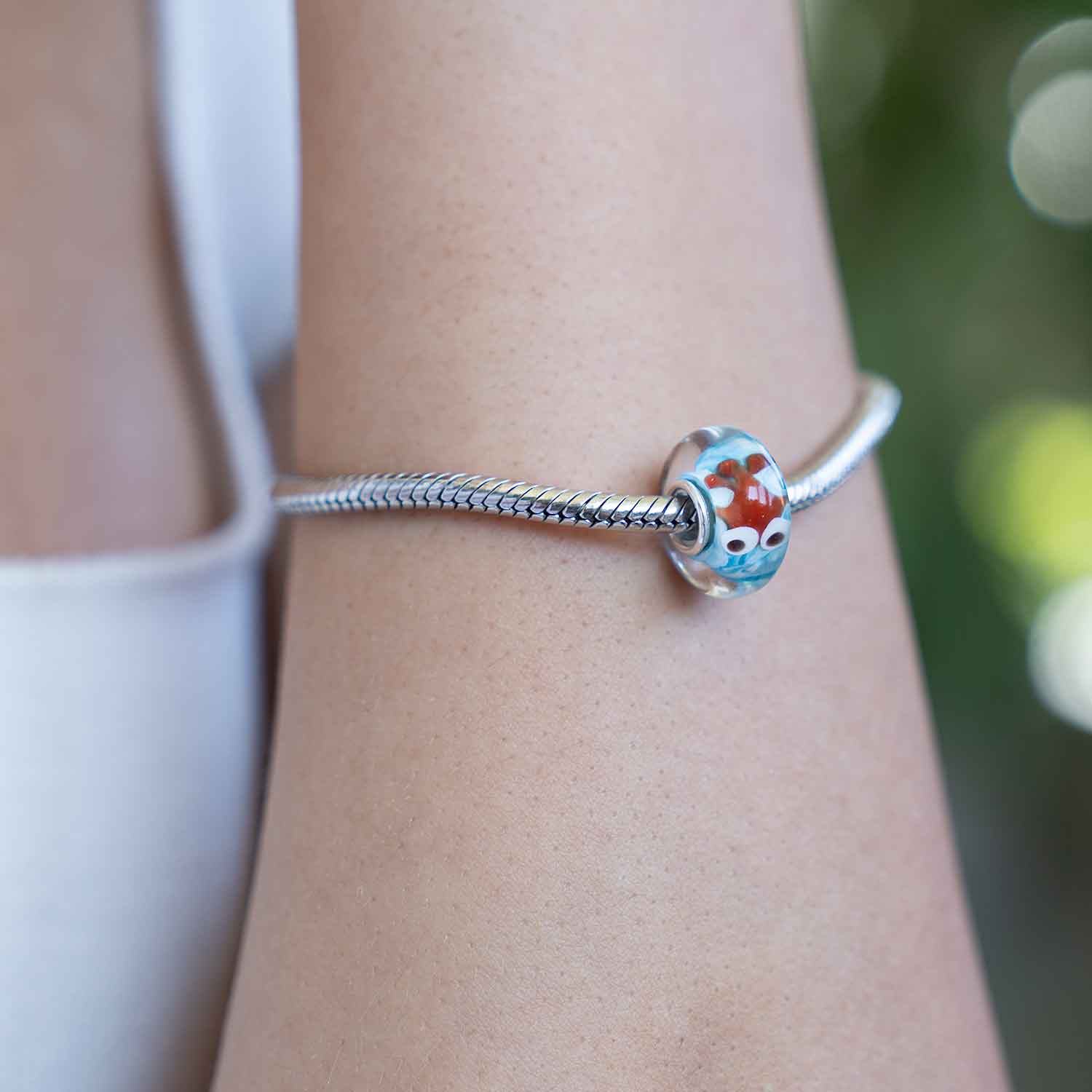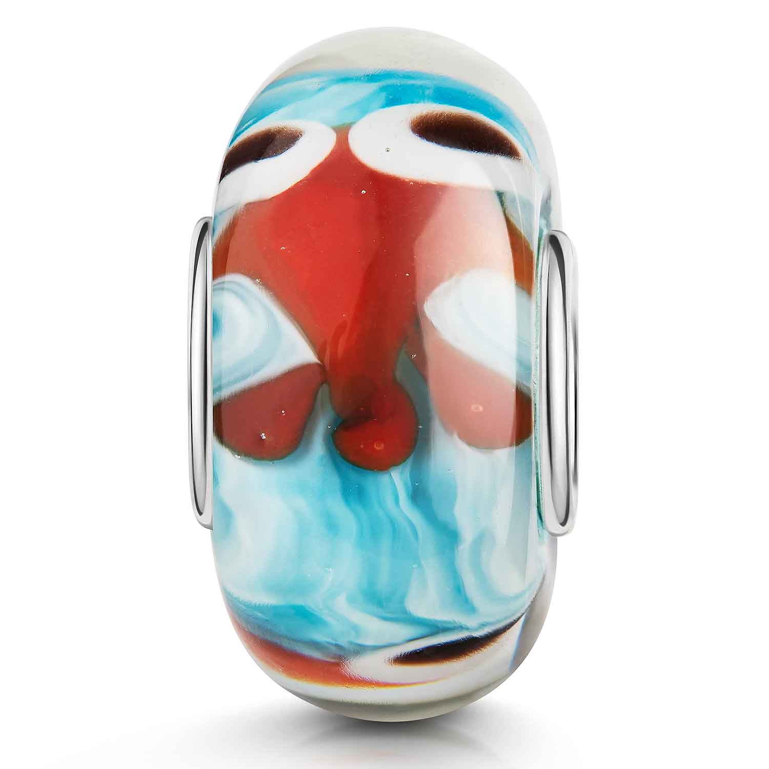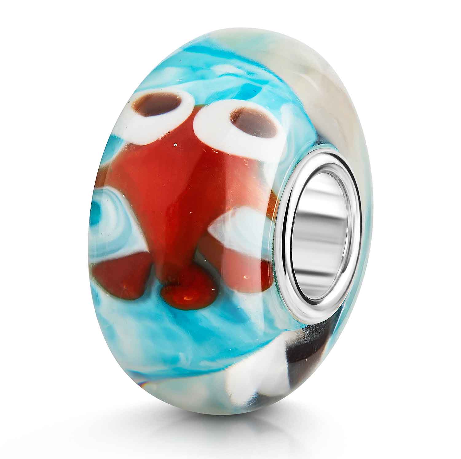 Blau-weißer Glas Bead mit rotem Fisch und Hülse aus 925 Sterling Silber. Dieses European Beads Element ist passend zu allen gängigen Schmuck Bead-Armbändern & Ketten anderer großer Marken bis max. 4,4mm Lochdurchmesser.