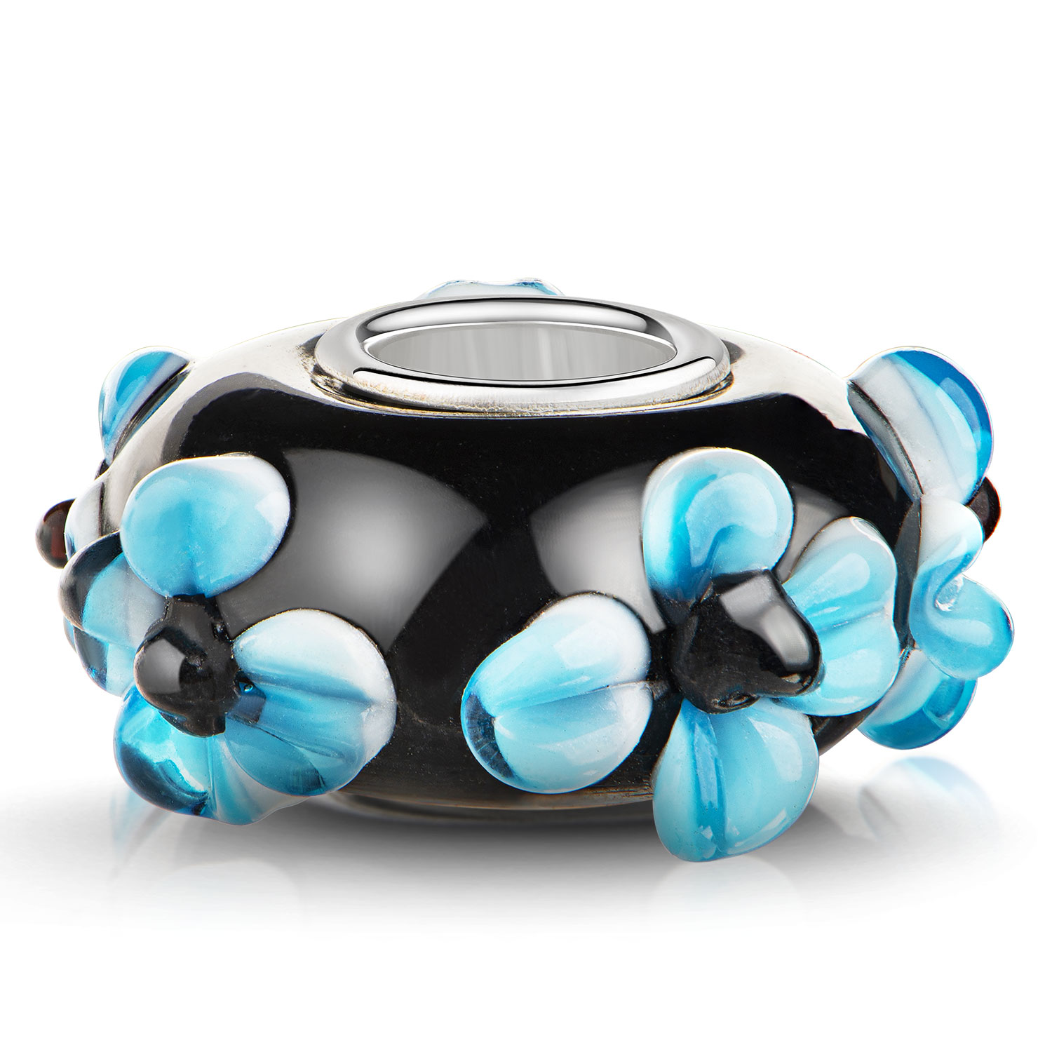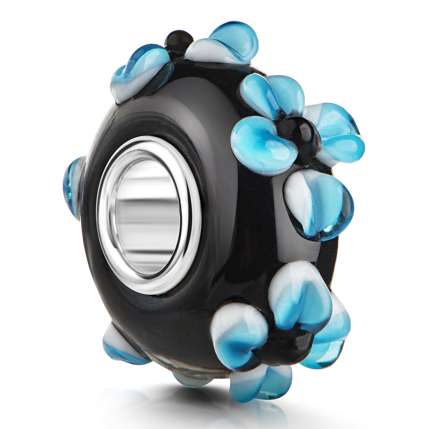 Schwarzer Glas Bead mit blau weißen Blumen im 3D-Design und einer Hülse aus 925 Sterling Silber für Beads Armbänder und Ketten bis max 4,4mm Durchmesser.