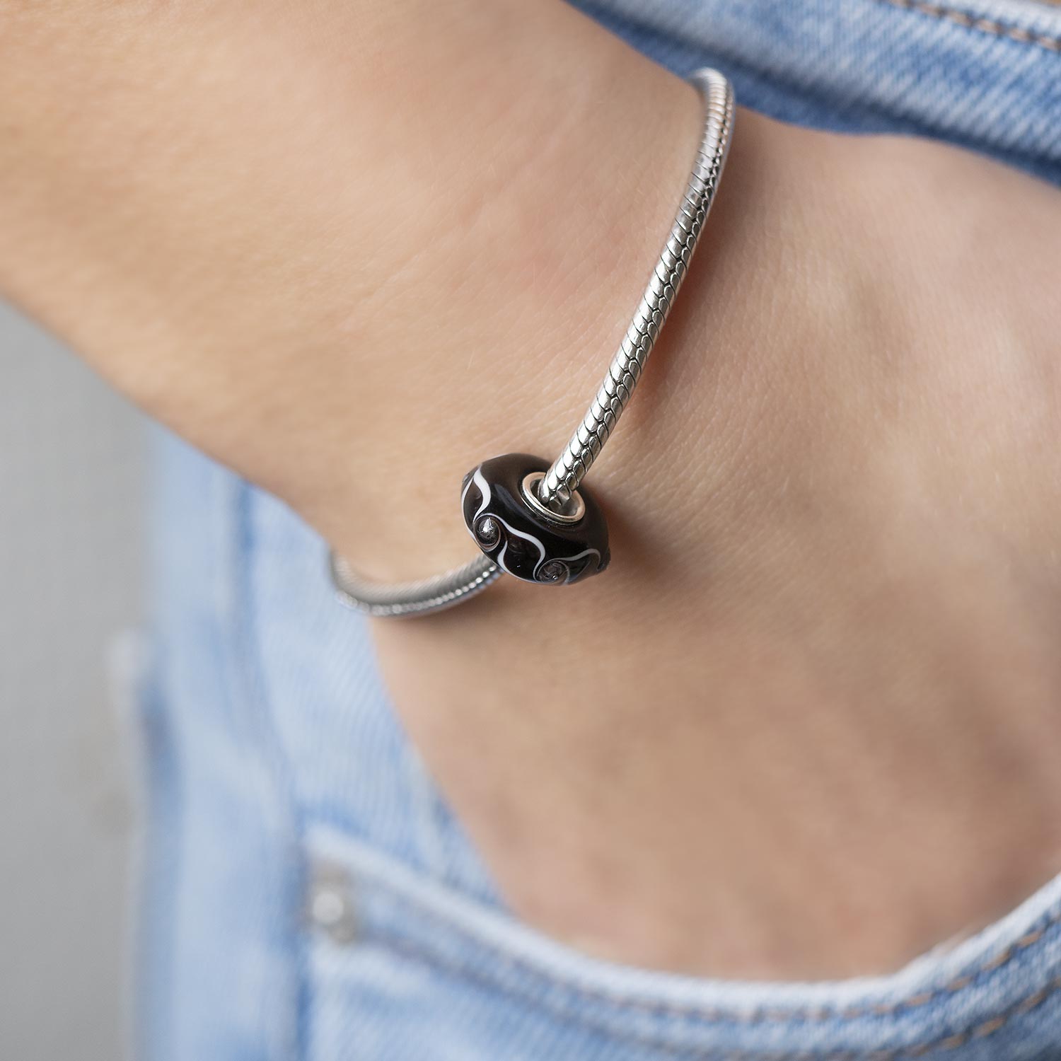 Schwarzer Glas Bead mit 3D Linien Muster und Hülse aus 925 Sterling Silber. Auslieferung inkl. Materia Satin Schmuckbeutel.